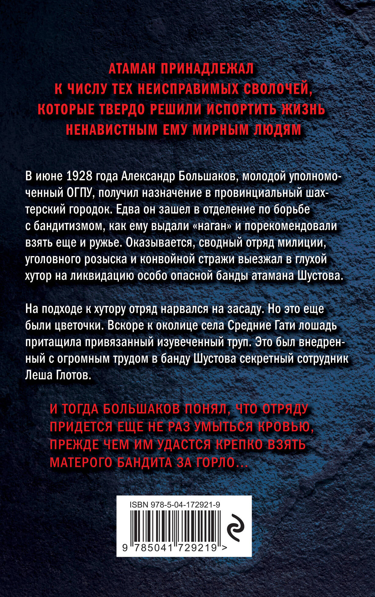 Атаман принадлежал к числу тех неисправимых сволочей, которые твердо решили испортить жизнь ненавистным ему мирным людям. В июне 1928 года Александр Большаков, молодой уполномоченный ОГПУ, получил назначение в провинциальный шахтерский городок. Едва он зашел в отделение по борьбе с бандитизмом, как ему выдали «наган» и порекомендовали взять еще и ружье. Оказывается, сводный отряд милиции, уголовного розыска и конвойной стражи выезжал в глухой хутор на ликвидацию особо опасной банды атамана Шустова. На подходе к хутору отряд нарвался на засаду. Но это еще были цветочки. Вскоре к околице села Средние Гати лошадь притащила привязанный изувеченный труп. Это был внедренный с огромным трудом в банду Шустова секретный сотрудник Леша Глотов. И тогда Большаков понял, что отряду придется еще не раз умыться кровью, прежде чем им удастся схватить матерого бандита за горло…| Издательство | ООО "Издательство "Эксмо" |