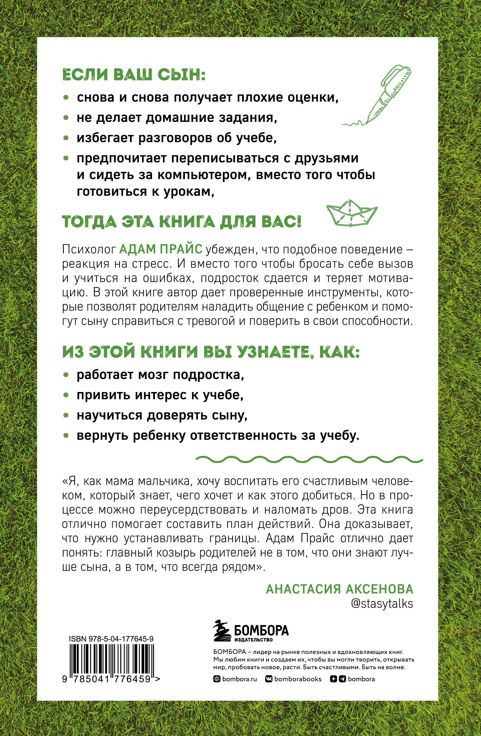 Ваш сын не аттестован в четверти? А вместо того, чтобы готовиться к контрольной, он уткнулся в телефон? «Ему как будто все равно. Он совсем не понимает, что сейчас важно», - сокрушаются родители. И в кого он такой лентяй? Но дело совсем не в лени, убежден эксперт по проблемам школьной успеваемости, психолог Адам Прайс. Так подросток справляется со стрессом. И вместо того, чтобы бросать себе вызов, учиться на ошибках и продолжать бороться за лучшие оценки, он сдается и теряет мотивацию. В книге вы найдете практики, которые позволят наладить контакт с ребенком, помогут сыну справиться с тревогой, поверить в свои способности и повысить мотивацию и интерес к учебе. Из этой книги вы узнаете, как: - работает мозг подростка; - привить интерес к учебе; - научиться доверять сыну; - вернуть ребенку ответственность за учебу. Адам Прайс - детский и подростковый психолог с более чем 20-летним опытом работы. Эксперт по успеваемости школьников. Автор мирового бестселлера и ряда научных и популярных статей на разные темы: от дисциплины до влияния видеоигр на детей.| Издательство | ООО "Издательство "Эксмо" |