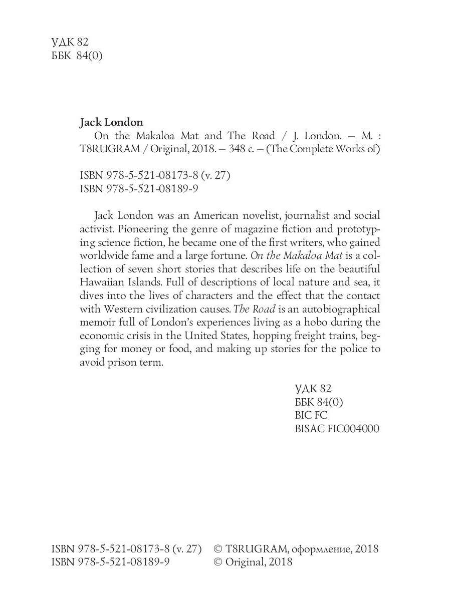 Jack London was an American novelist, journalist and social activist. Pioneering the genre of magazine fiction and prototyping science fiction, he became one of the first writers, who gained worldwide fame and a large fortune. On the Makaloa Mat is a collection of seven short stories that describes life on the beautiful Hawaiian Islands. Full of descriptions of local nature and sea, it dives into the lives of characters and the effect that the contact with Western civilization causes. The Road is an autobiographical memoir full of London's experiences living as a hobo during the economic crisis in the United States, hopping freight trains, begging for money or food, and making up stories for the police to avoid prison term.| Издательство | Т8 RUGRAM |