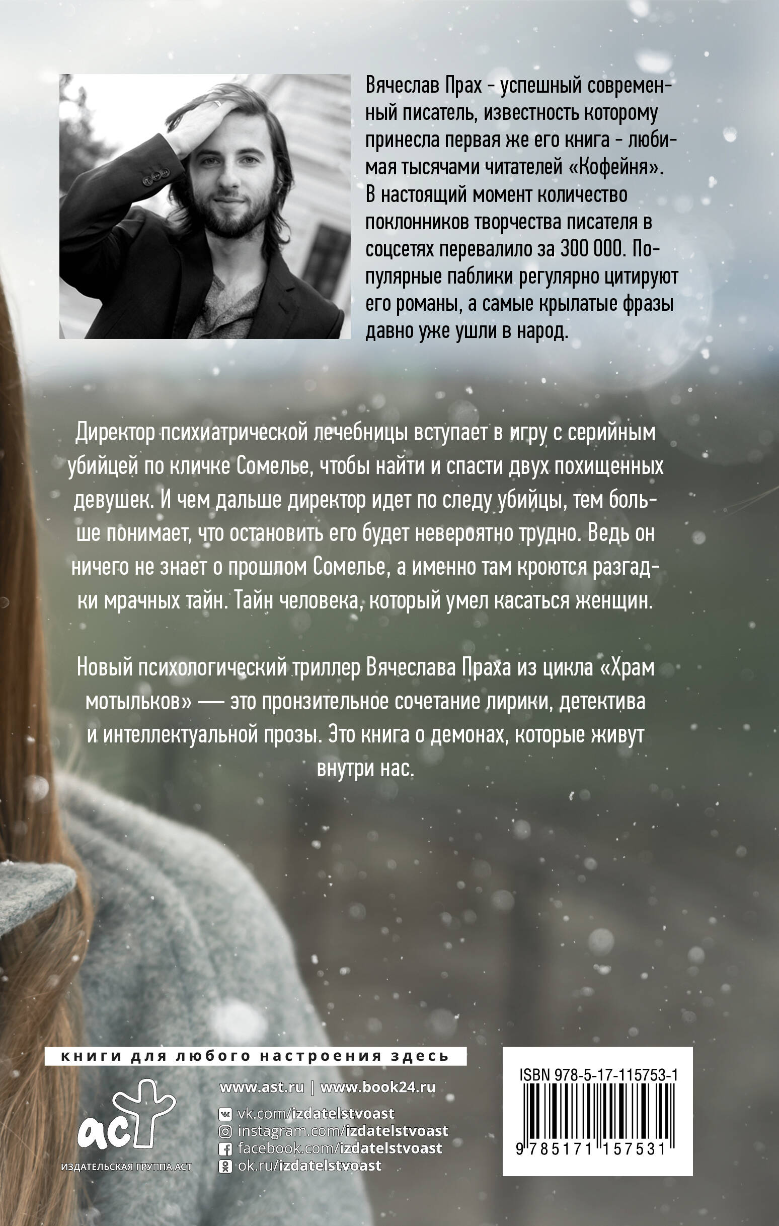 Директор психиатрической лечебницы вступает в игру с серийным убийцей по кличке Сомелье, чтобы найти и спасти двух похищенных девушек. И чем дальше директор идет по следу убийцы, тем больше понимает, что остановить его будет невероятно трудно. Ведь он ничего не знает о прошлом Сомелье, а именно там кроются разгадки мрачных тайн. Тайн человека, который умел касаться женщин. Новый психологический триллер Вячеслава Праха из цикла "Храм мотыльков" - это пронзительное сочетание лирики, детектива и интеллектуальной прозы. Это книга о демонах, которые живут внутри нас.| Издательство | Издательство "АСТ" |