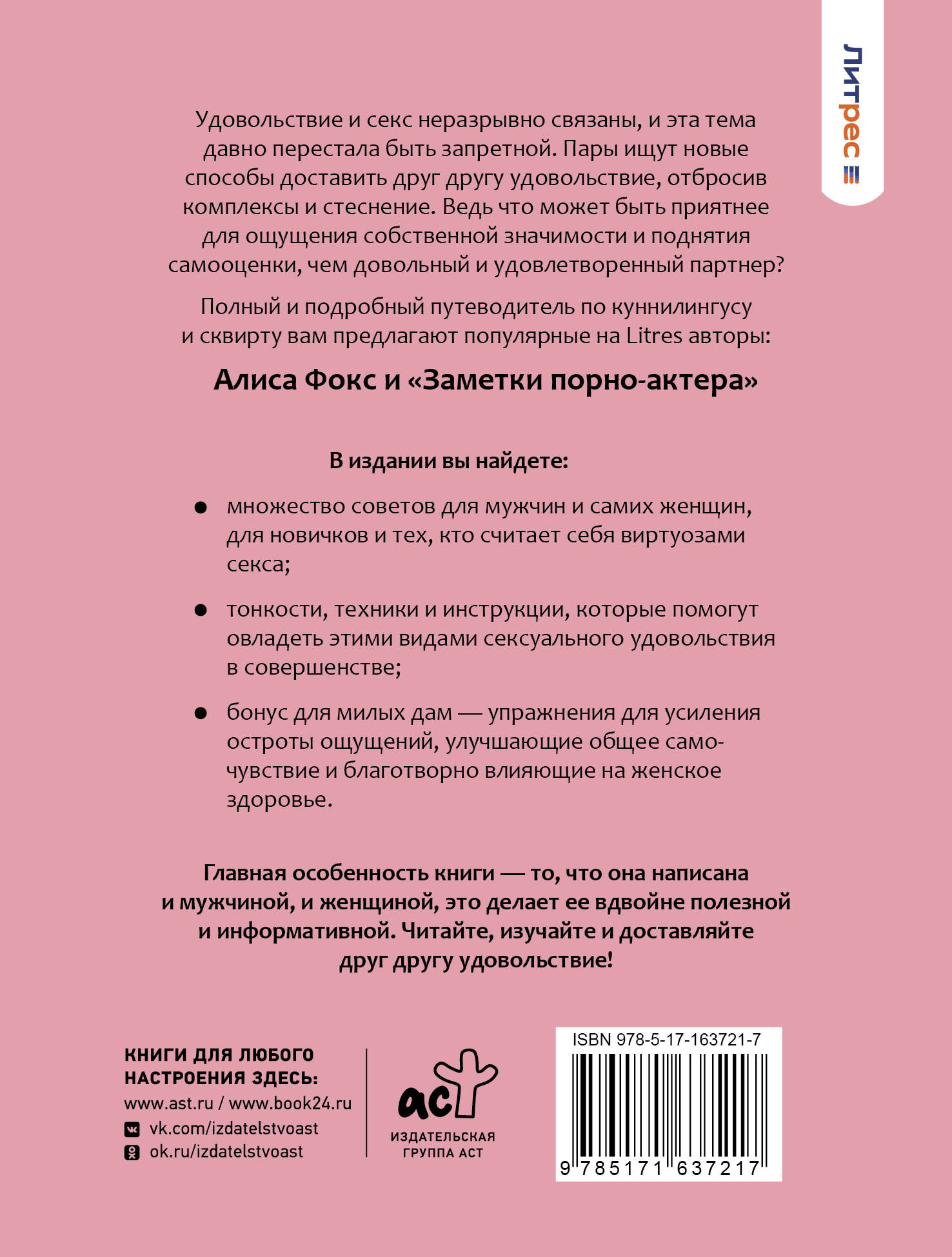 Удовольствие и секс неразрывно связаны, и эта тема давно перестала быть запретной. Пары ищут новые способы доставить друг другу удовольствие, отбросив комплексы и стеснение. Ведь что может быть приятнее для ощущения собственной значимости и поднятия самооценки, чем довольный и удовлетворенный партнер? Полный и подробный путеводитель по куннилингусу и сквирту вам предлагают популярные на Litres авторы: Алиса Фокс и "Заметки порно-актера". В издании вы найдете: • множество советов для мужчин и самих женщин, для новичков и тех, кто считает себя виртуозами секса; • тонкости, техники и инструкции, которые помогут овладеть этими видами сексуального удовольствия в совершенстве; • бонус для милых дам - упражнения для усиления остроты ощущений, улучшающие общее самочувствие и благотворно влияющие на женское здоровье. Главная особенность книги - то, что она написана и мужчиной, и женщиной, это делает ее вдвойне полезной и информативной. Читайте, изучайте и доставляйте друг другу удовольствие!| Издательство | Издательство "АСТ" |