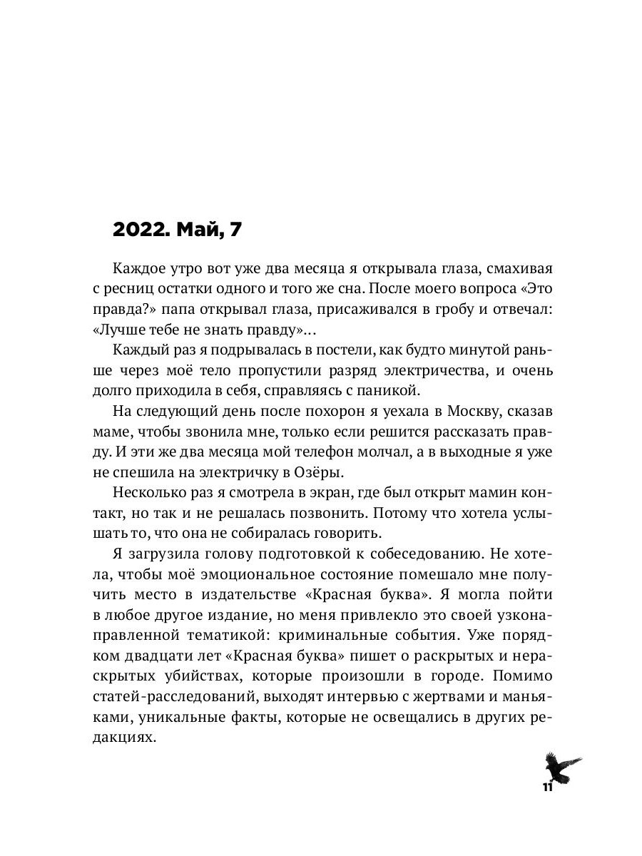 В день похорон Рита случайно узнаёт, что он не был ей родным. Мать отказывается рассказывать ей что-либо о настоящем отце. Не найдя компромисса, они ссорятся, и Рита уезжает из города. Но звонок из больницы с номера матери вынуждает Риту забыть обиду и вернуться. Лиза сломала бедро, её нельзя оставлять одну. И мать с дочерью принимают решение продать дом и вместе переехать в столицу. Во время сбора вещей Рита находит в подвале дома коробку, где собрана вся правда о её родном отце…| Издательство | Т8 RUGRAM |