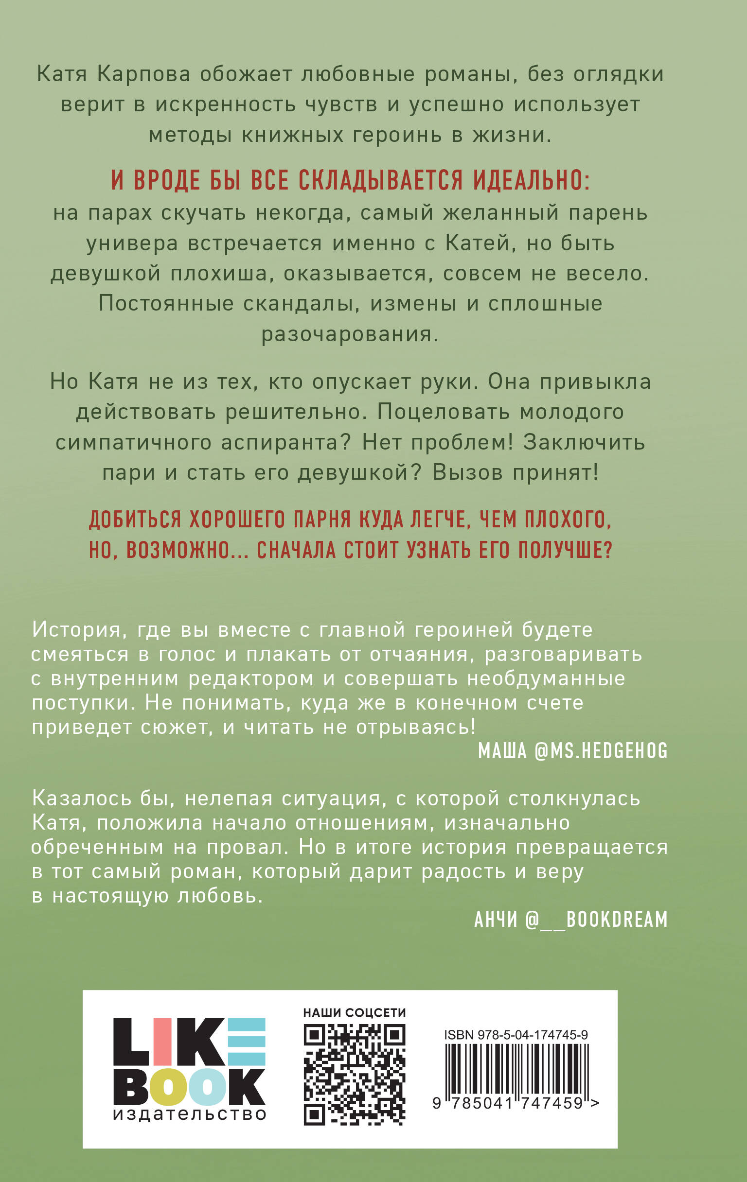 Она знает, как завоевать сердце хулигана. Но кто сможет пленить ее сердце? Катя Карпова обожает любовные романы, без оглядки верит в искренность чувств и успешно использует методы книжных героинь в жизни. И вроде бы все складывается идеально: на парах скучать некогда, самый желанный парень универа встречается именно с Катей, но быть девушкой плохиша, оказывается, совсем не весело. Постоянные скандалы, измены и сплошные разочарования. Но Катя не из тех, кто опускает руки. Она привыкла действовать решительно. Поцеловать молодого симпатичного аспиранта? Нет проблем! Заключить пари и стать его девушкой? Вызов принят! Добиться хорошего парня куда легче, чем плохого, но, возможно... сначала стоит узнать его получше?| Издательство | ООО "Издательство "Эксмо" |