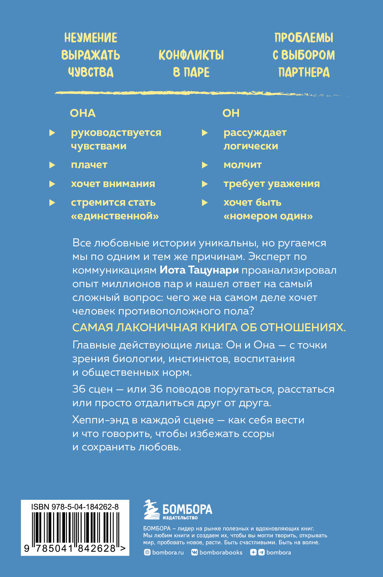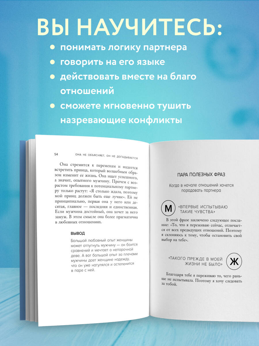 ОБ АВТОРЕ Тацунари Иота - японский писатель, психолог-консультант. О себе говорит: «Я считаю себя кем-то вроде переводчика, при помощи которого мужчинам и женщинам проще общаться друг с другом». НЕСКОЛЬКО «ПОЛЕЗНЫХ ФРАЗ» ИЗ КНИГИ Для мужчин: - СЕГОДНЯ ТЫ ВЫГЛЯДИШЬ КАК-ТО НЕОБЫЧНО. Даже если вы на самом деле не замечаете перемен, эта фраза продемонстрирует ваше внимательное отношение к партнерше. Если услышите в ответ: «Думаешь? Я немного изменила прическу», - считайте, дело в шляпе. - Я ОБЯЗАТЕЛЬНО ЖЕНЮСЬ, КОГДА ВСТРЕЧУ ТУ САМУЮ. На этапе знакомства и первых свиданий не спешите отрицать свою полную неготовность к браку - этим вы можете навести симпатичную вам женщину на мысль, что ей незачем терять с вами время. Для женщин: - ПРЕЖДЕ ВСЕГО, ТРИ МОМЕНТА... Мужчины считают, что женщины слишком эмоциональны и часто упускают суть. Если вы хотите быть услышанной, начинайте с самого главного. - ДАВАЙ Я СДЕЛАЮ ГОРЯЧИЕ БУТЕРБРОДЫ И МЫ ПОСМОТРИМ КИНО. Период ухаживаний и свиданий утомил вашего партнера, и теперь, когда вы вместе, он хочет немного расслабиться. Идите иногда на уступки и проводите время так, как хочет он. В новомодный ресторан ведь можно сходить и с подружкой.| Издательство | ООО "Издательство "Эксмо" |