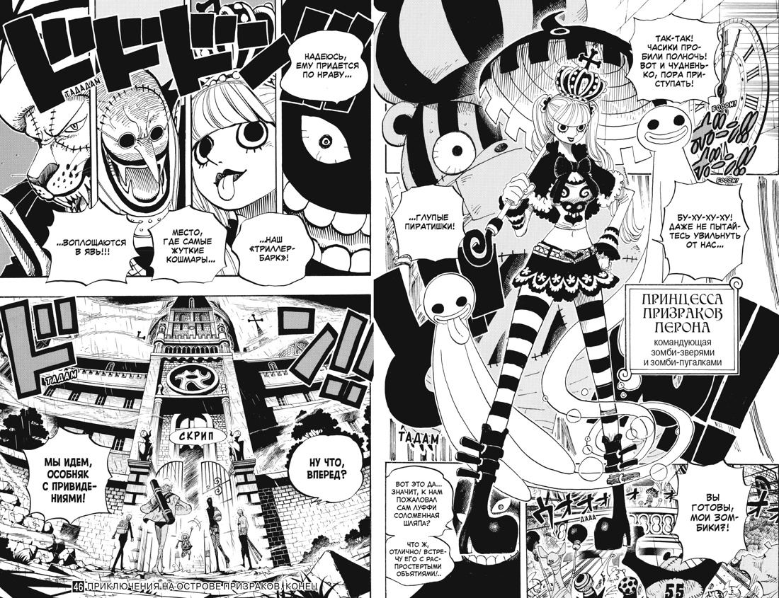 Путешествие Луффи и его соратников продолжается! Освободив Нико Робин из плена СП9, пиратская шайка вновь отправляется в плавание: их следующая остановка - остров Рыболюдей. Однако в море экипаж встречает непогода, и корабль заносит в загадочный Флорианский Треугольник, дьявольские воды, о которых ходит множество жутких легенд. И здесь на пути у команды Соломенной Шляпы возникает Триллер-Барк, плавучий остров призраков...