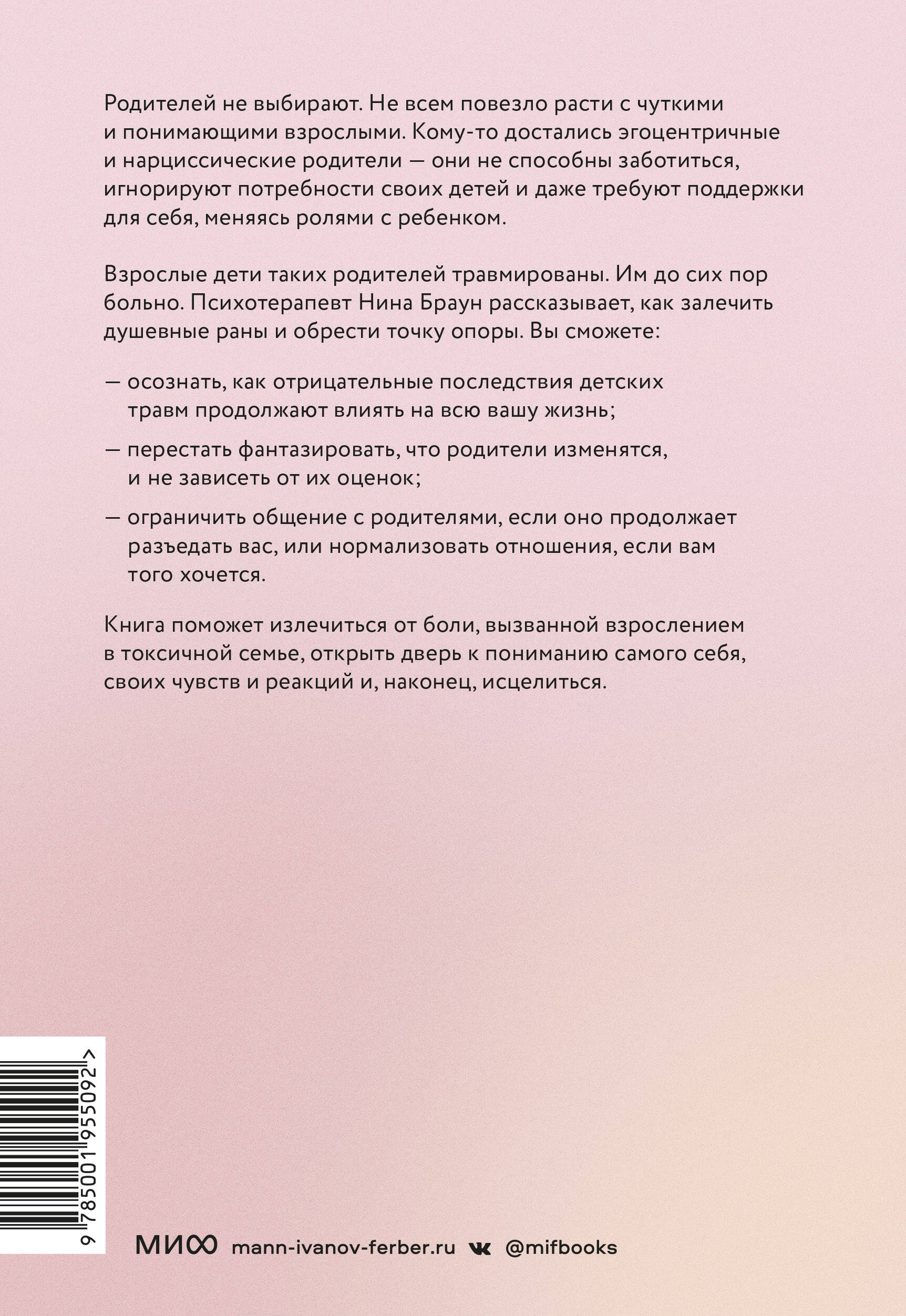 Пошаговое руководство от психотерапевта о том, как преодолеть детские травмы, обрести свободу от токсичного влияния родителей и построить с ними здоровые отношения. Родителей не выбирают. Не всем повезло расти с чуткими и понимающими взрослыми. Кому-то достались эгоцентричные и нарциссические родители - они не способны заботиться, игнорируют потребности своих детей и даже требуют поддержки для себя, меняясь ролями. Взрослые дети таких родителей травмированы. Им до сих пор больно. Психотерапевт Нина Браун рассказывает, как залечить душевные раны и обрести точку опоры. Вы сможете: - распознать негативный отпечаток событий из детства на свою жизнь; - перестать фантазировать, что родители изменятся, и не зависеть от их оценок; - ограничить общение с родителями, если оно продолжает разъедать вас, или нормализовать отношения, если вам того хочется. Книга поможет излечиться от боли, вызванной взрослением в токсичной семье, открыть дверь к пониманию самого себя, своих чувств и реакций и, наконец, исцелиться. Для кого книга: Для взрослых детей, которые испытывают трудности в отношениях с родителями и с собой. Для тех, кто стремится освободиться от негативного влияния отца или матери и жить счастливо и полноценно. От автора: Если дети растут в семье эгоцентричных родителей, то, став взрослыми, они могут столкнуться с затяжными негативными последствиями этих нездоровых отношений. Таких людей бывает легко принудить делать то, что им неприятно, например, с помощью манипуляций, обольщения или запугивания. Им может быть сложно завязывать и поддерживать гармоничные, прочные отношения. Они могут оказаться не способны говорить "нет" и твердо стоять на своем, бывают склонны к негативным установкам и формам поведения как с другими людьми, так и со своими родителями-нарциссами. Отрицательные последствия детских травм продолжают влиять на их здоровье и самооценку, что, в свою очередь, оказывает воздействие на другие аспекты жизни, особенно на личные отношения. Цель этой книги - помочь читателям глубже понять сохраняющееся негативное влияние эгоцентричного отца или матери на их развитие и жизнь. Так как глубокого осознания в чистом виде может быть недостаточно, я также даю рекомендации для положительных личных изменений - упражнения и стратегии, которые помогут устранить отрицательные последствия и стать тем человеком, каким они хотят себя видеть. Я надеюсь, что эта книга воодушевит вас и откроет дверь к пониманию самого себя, своих чувств, реакций и даже некоторых действий. Возможно, вы хотите в себе что-то изменить, и чтение натолкнет вас на мысль, как добиться этих изменений, чтобы освободиться от негативного влияния эгоцентричного отца или матери и начать счастливую и полноценную жизнь.| Издательство | МАНН, ИВАНОВ И ФЕРБЕР ООО |