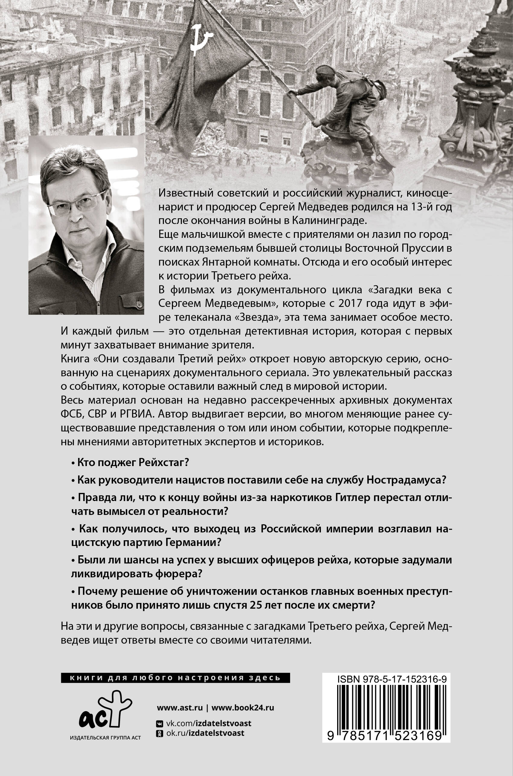 Книга «Они создавали Третий рейх» открывает авторскую серию Сергея Медведева, основанную на документальных сценариях одноименных телепередач. Это увлекательный рассказ о событиях, которые оставили важный след в мировой истории. Весь материал основан на недавно рассекреченных архивных документах ФСБ, СВР и РГВИА. Автор выдвигает версии, во многом меняющие ранее существующие представления о том или ином событии, которые подкреплены мнениями авторитетных экспертов и историков.| Издательство | Издательство "АСТ" |