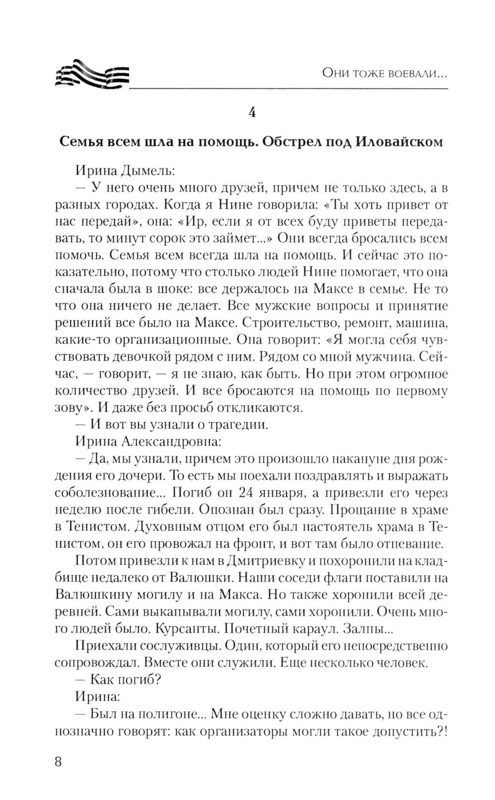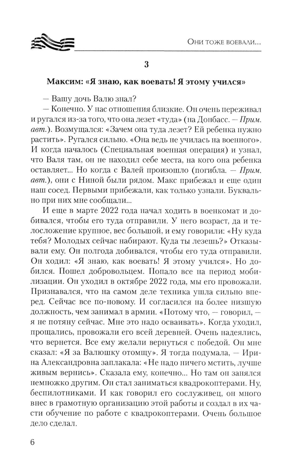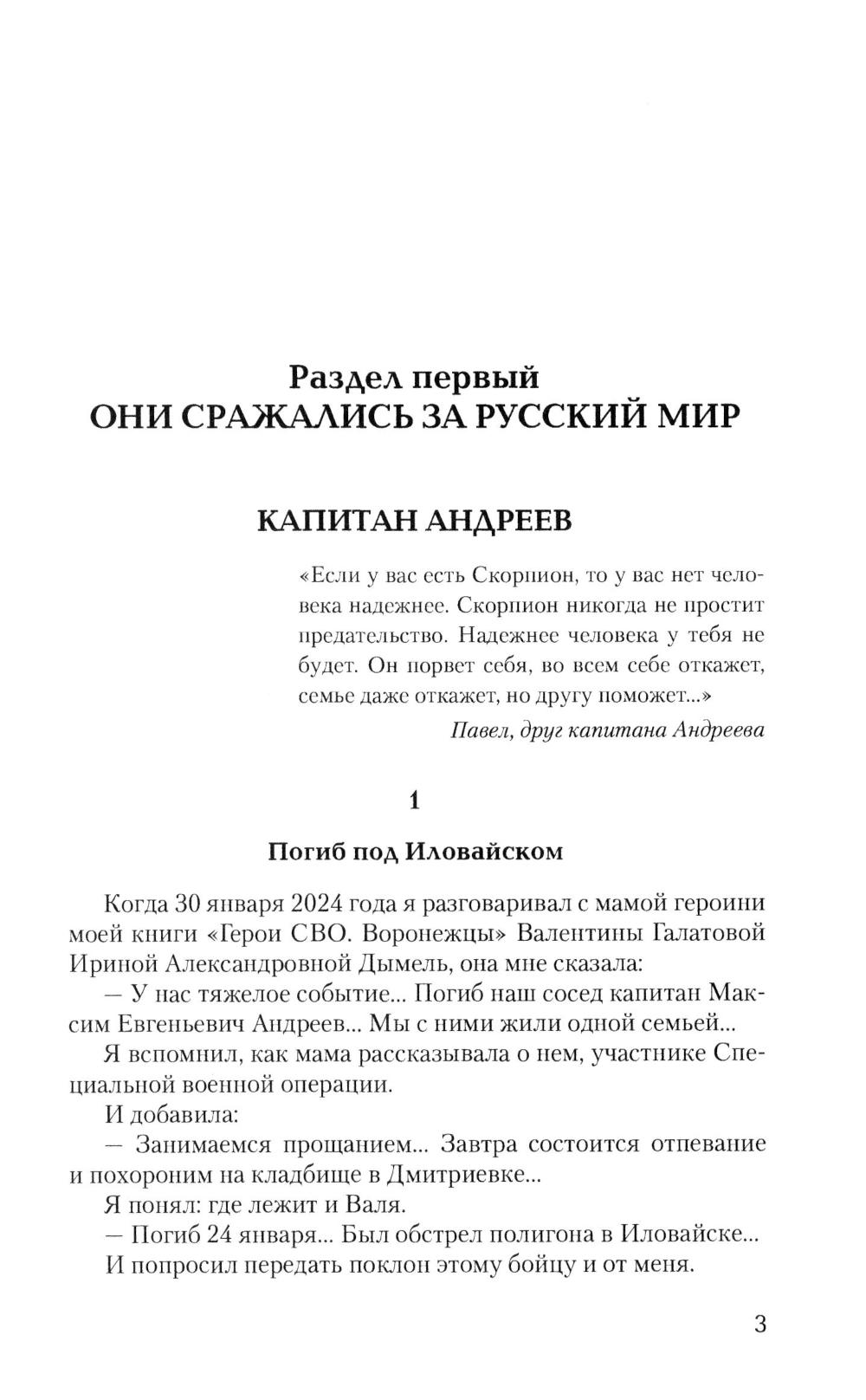 В новой книге писателя и журналиста Михаила Фёдорова рассказано об участниках спецоперации на Украине - летчиках, десантниках, операторах беспилотников, мотострелках, штурмовиках, ветеранах милиции, чьи сыновья на СВО заняты доставкой гуманитарной помощи бойцам. Автор приводит волнующий рассказ командира батальона «Барс» о добровольцах, захвативших Дорожнянку, штурмовавших Червоное, дравшихся на линии Площанка - Кременная. В книге повествуется о тех, кто спасал людей в «Крокус-Сити-Холле». О летчиках, ставших на пути движения колонн мятежных вагнеровцев на Москву. В книгу включена документальная повесть «Выстрелы у деревни Оськино» о драме, разыгравшейся в одном из отрядов ЧВК «Вагнер». Автор рисует широкую картину недавних событий, взволновавших нашу страну.| Издательство | Вече |