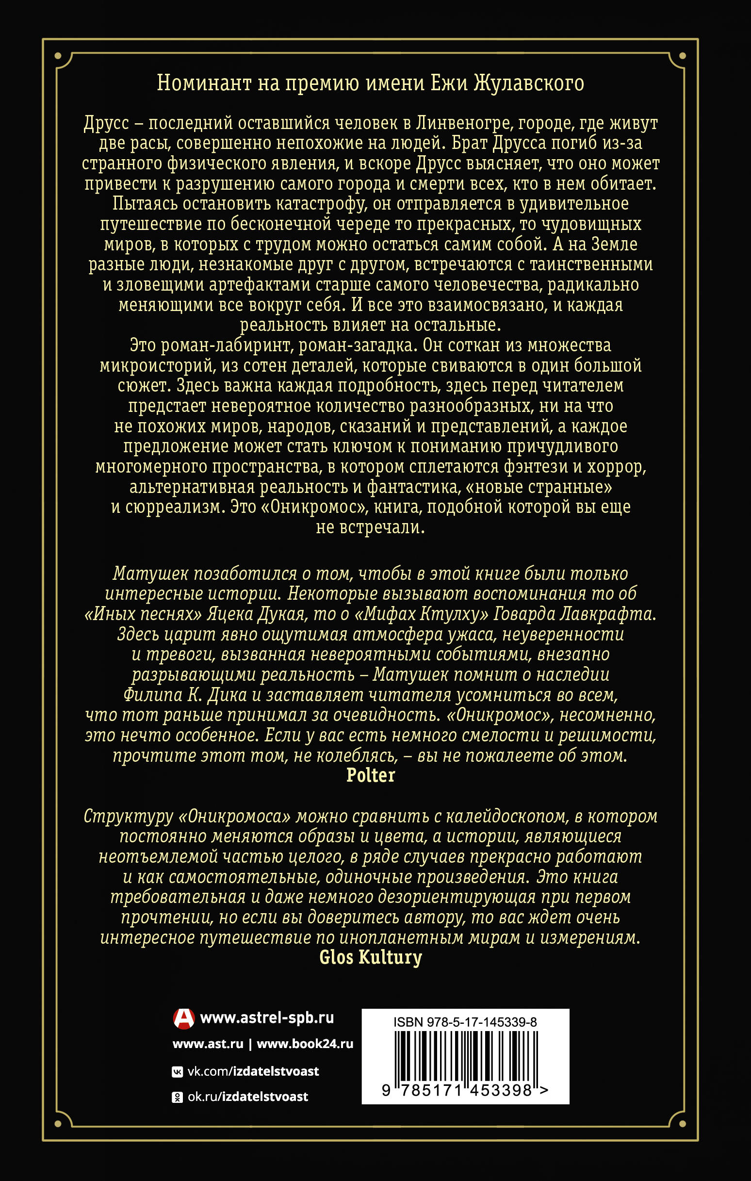 Друсс - последний оставшийся человек в Линвеногре, городе, где живут две расы, совершенно непохожие на людей. Брат Друсса погиб из-за странного физического явления, и вскоре Друсс выясняет, что оно может привести к разрушению самого города и смерти всех, кто в нем обитает. Пытаясь остановить катастрофу, он отправляется в удивительное путешествие по бесконечной череде то прекрасных, то чудовищных миров, в которых с трудом можно остаться самим собой. А на Земле разные люди, незнакомые друг с другом, встречаются с таинственными и зловещими артефактами старше самого человечества, радикально меняющими все вокруг себя. И все это взаимосвязано, и каждая реальность влияет на остальные. Это роман-лабиринт, роман-загадка. Он соткан из множества микроисторий, из сотен деталей, которые свиваются в один большой сюжет. Здесь важна каждая подробность, здесь перед читателем предстает невероятное количество разнообразных, ни на что не похожих миров, народов, сказаний и представлений, а каждое предложение может стать ключом к пониманию причудливого многомерного пространства, в котором сплетаются фэнтези и хоррор, альтернативная реальность и фантастика, "новые странные" и сюрреализм. Это "Оникромос", книга, подобной которой вы еще не встречали.| Издательство | Издательство "АСТ" |