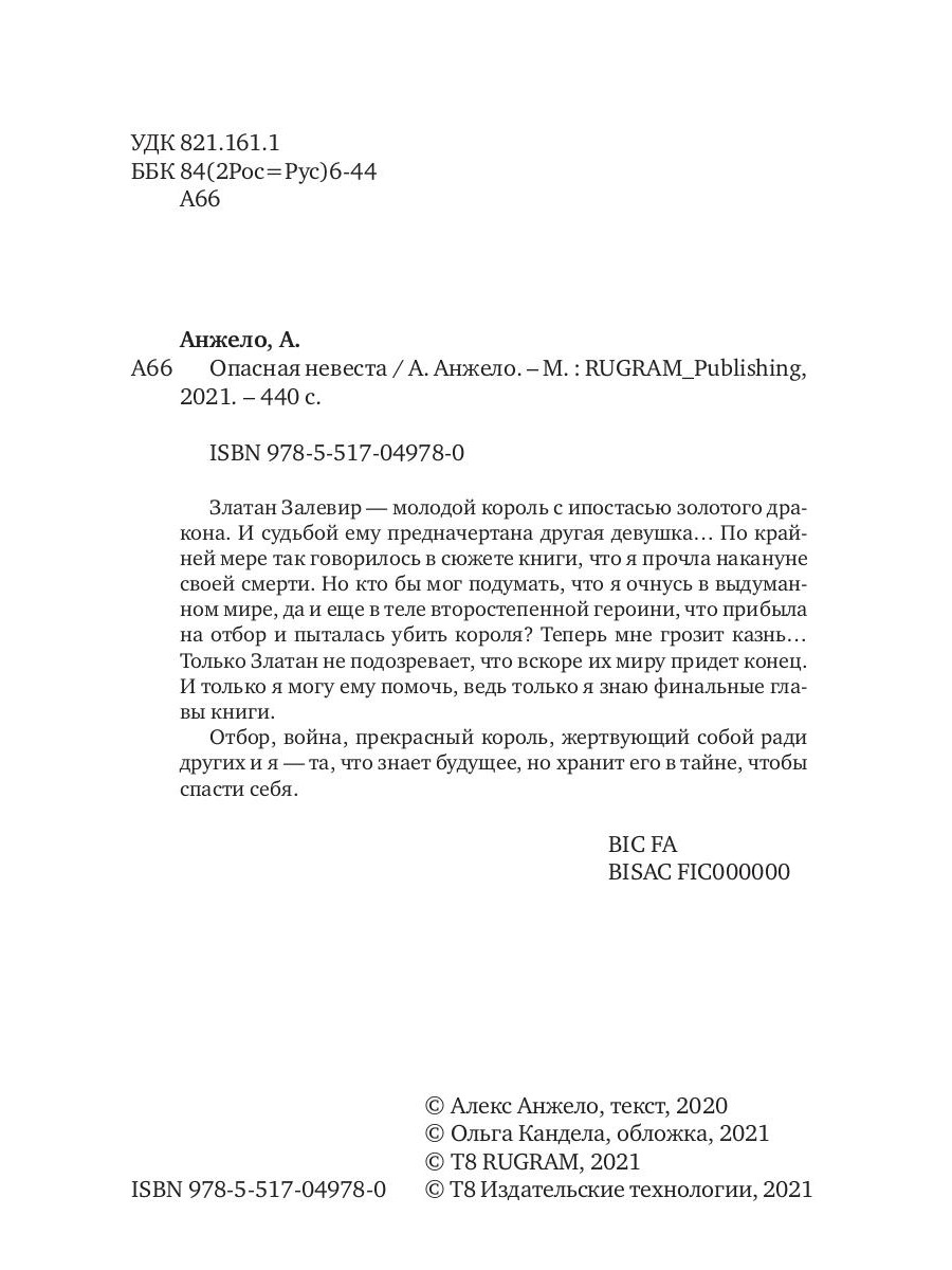 Златан Залевир - молодой король с ипостасью золотого дракона. И судьбой ему предначертана другая девушка... По крайней мере так говорилось в сюжете книги, что я прочла накануне своей смерти. Но кто бы мог подумать, что я очнусь в выдуманном мире, да и еще в теле второстепенной героини, что прибыла на отбор и пыталась убить короля? Теперь мне грозит казнь... Только Златан не подозревает, что вскоре их миру придет конец. И только я могу ему помочь, ведь только я знаю финальные главы книги. Отбор, война, прекрасный король, жертвующий собой ради других и я - та, что знает будущее, но хранит его в тайне, чтобы спасти себя.| Издательство | Т8 RUGRAM |