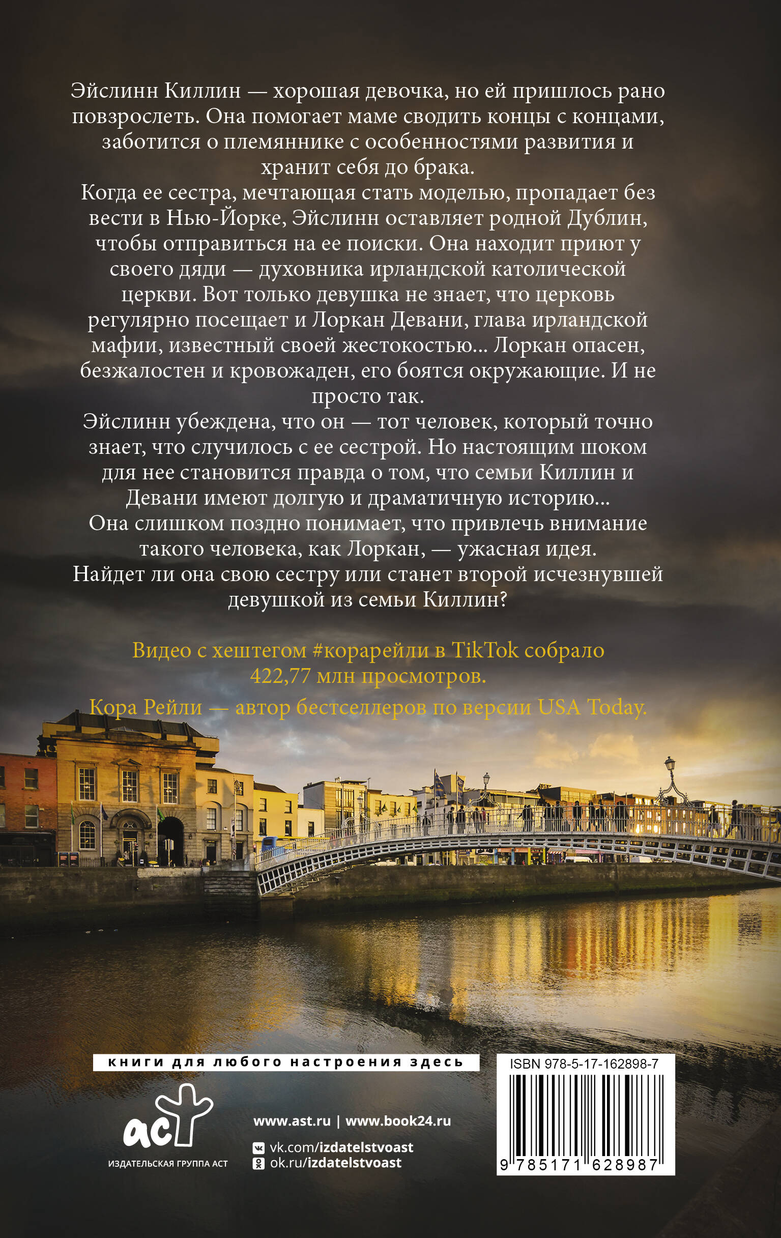 Эйслинн Киллин - хорошая девочка, но ей пришлось рано повзрослеть. Она помогает маме сводить концы с концами, заботится о племяннике с особенностями развития и хранит себя до брака. Когда ее сестра, мечтающая стать моделью, пропадает без вести в Нью-Йорке, Эйслинн оставляет родной Дублин, чтобы отправиться на ее поиски. Она находит приют у своего дяди - духовника ирландской католической церкви. Вот только девушка не знает, что церковь регулярно посещает и Лоркан Девани, глава ирландской мафии, известный своей жестокостью... Лоркан опасен, безжалостен и кровожаден, его боятся окружающие. И не просто так. Эйслинн убеждена, что он - тот человек, который точно знает, что случилось с ее сестрой. Но настоящим шоком для нее становится правда о том, что семьи Киллин и Девани имеют долгую и драматичную историю... Она слишком поздно понимает, что привлечь внимание такого человека, как Лоркан, - ужасная идея. Найдет ли она свою сестру или станет второй исчезнувшей девушкой из семьи Киллин? Кора Рейли - автор бестселлеров по версии USA Today. Видео с хештегом #корарейли в TikTok собрало 422.77 млн просмотров.| Издательство | Издательство "АСТ" |