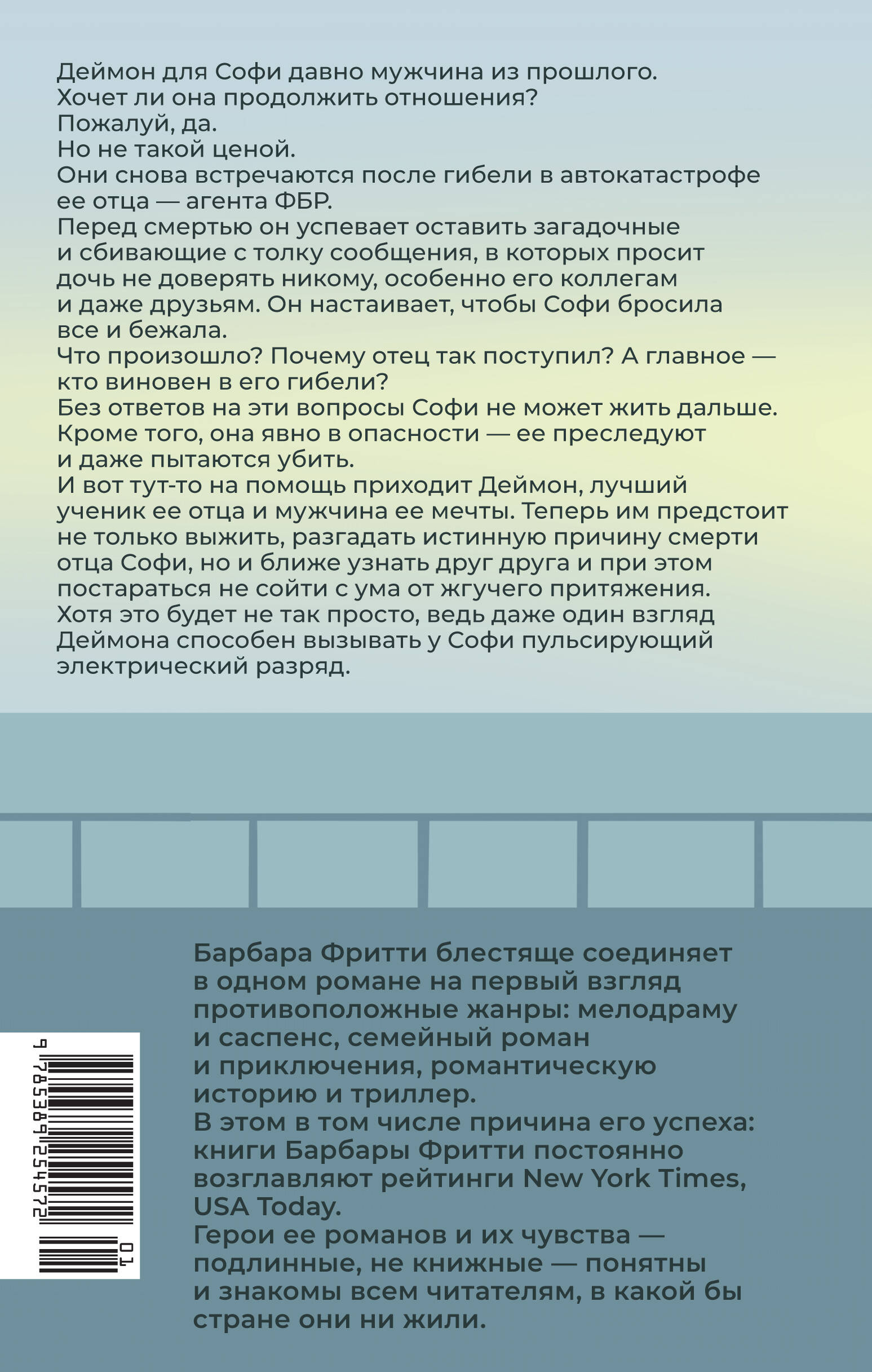 Барбара Фритти блестяще соединяет в одном романе на первый взгляд противоположные жанры: мелодраму и саспенс, семейный роман и приключения, романтическую историю и триллер. В этом в том числе причина его успеха: книги Барбары Фритти постоянно возглавляют рейтинг New York Times, USA Today. Герои ее романов и их чувства - подлинные, не книжные - понятны и знакомы всем читателям, в какой бы стране они ни жили. Деймон для Софи давно мужчина из прошлого.Хочет ли она продолжить отношения? Пожалуй, да.Но не такой ценой. Они снова встречаются после гибели в автокатастрофе ее отца - агента ФБР. Перед смертью он успевает оставить загадочные и сбивающие с толку сообщения, в которых просит дочь не доверять никому, особенно его коллегам и даже друзьям. Он настаивает, чтобы Софи бросила все и бежала. Что произошло? Почему отец так поступил? А главное - кто виновен в его гибели? Без ответов на эти вопросы Софи не может жить дальше. Кроме того, она явно в опасности - ее преследуют и даже пытаются убить.И вот тут-то на помощь приходит Деймон, лучший ученик ее отца и мужчина ее мечты. Теперь им предстоит не только выжить, разгадать истинную причину смерти отца Софи, но и ближе узнать друг друга и при этом постараться не сойти с ума от жгучего притяжения. Хотя это будет не так просто, ведь даже один взгляд Деймона способен вызывать у Софи пульсирующий электрический разряд.| Издательство | Азбука-Аттикус Издат.группа ООО |