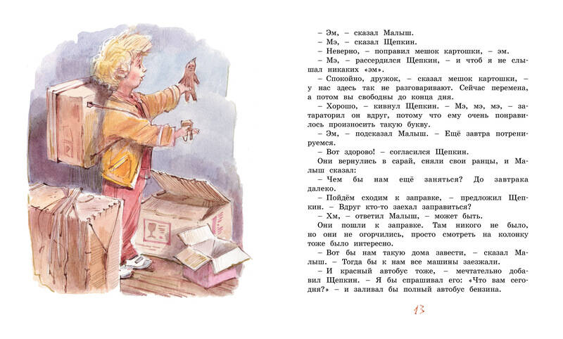 Малышу, которого на самом деле зовут Андреас, скоро исполнится пять лет. Он вместе с мамой, папой и братом уже год живёт в новом доме у дороги. Мама по-прежнему работает продавщицей в магазине, чтобы помочь папе выплатить кредит за дом. И Малыш каждый день ездит с мамой на работу. А пока она занята делами, он со своим лучшим другом Щепкиным играет на улице. И вот однажды они придумали игру, в которой Щепкин понарошку стал водителем грузовика. И надо же было такому случиться - Щепкин и в самом деле уехал на грузовике. И путешествие его оказалось довольно опасным…| Издательство | Азбука-Аттикус Издат.группа ООО |