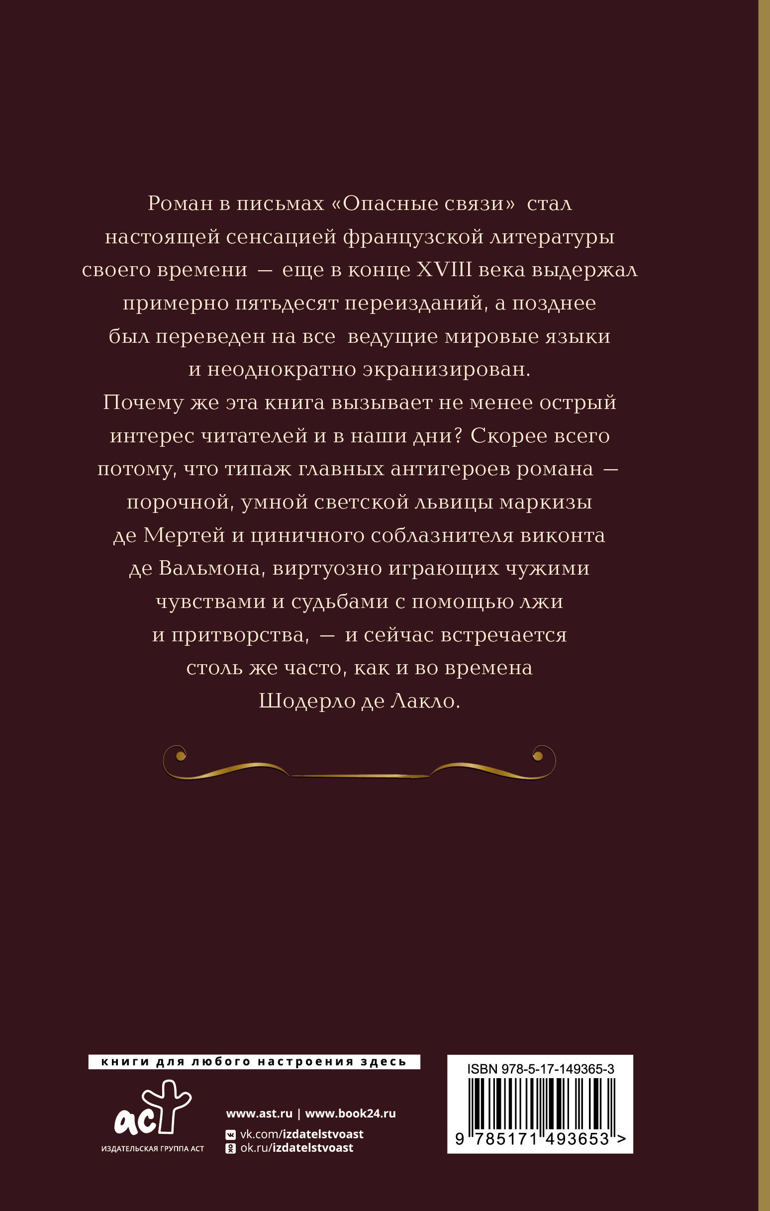 Основанный на реальных событиях эпистолярный роман французского генерала Шодерло де Лакло стал настоящей сенсацией французской литературы своего времени - еще в конце XVIII века книга выдержала примерно пятьдесят переизданий, а позднее была переведена на все ведущие мировые языки и неоднократно экранизирована. Роман «Опасные связи» состоит из 175 писем нескольких человек. Мы будто подглядываем в замочную скважину, и узнаем о тайных желаниях, мыслях и чувствах героев, о интригах и светских играх, меняющих судьбы…| Издательство | АСТ |