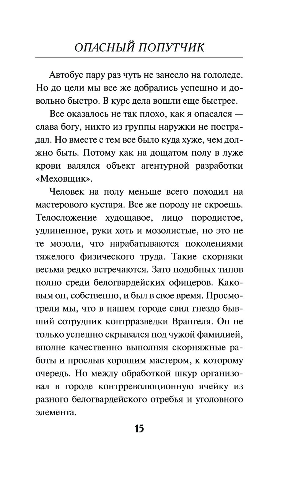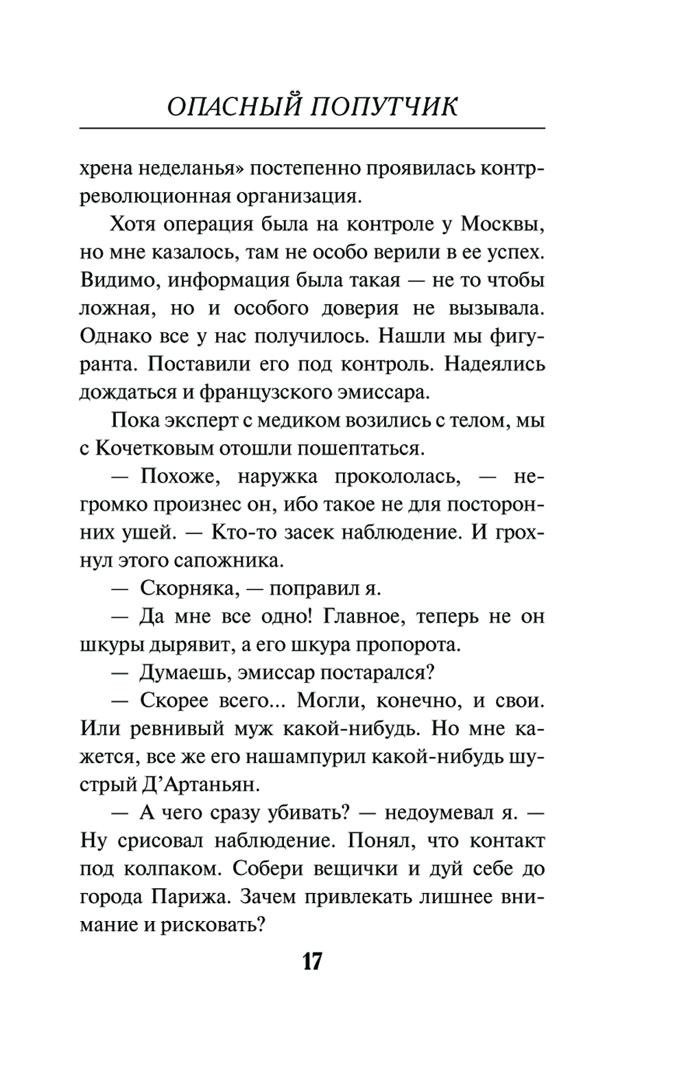 Холодной ноябрьской ночью 1933 года сотрудника оперативного отдела ОГПУ Александра Большакова вызвали на место преступления. В своем доме профессиональным ударом шила был убит объект агентурной разработки по прозвищу «Меховщик». Оперативники выяснили, что «Меховщик» ждал прибытия важной персоны - представителя белой эмиграции, эмиссара из Парижа. Вероятнее всего эмиссар и был убийцей: на месте преступления он по неосторожности наступил в лужу крови и оставил след. Группа ОГПУ сумела выследить подозреваемого на вокзале. «Француз» купил билет в мягкий вагон скорого поезда на Москву. И тогда срочно было принято решение: в это же купе подсадить оперативника, довести шпиона до Москвы и там передать под контроль местных коллег. Но дерзкий план внезапно дал осечку...| Издательство | Эксмо |