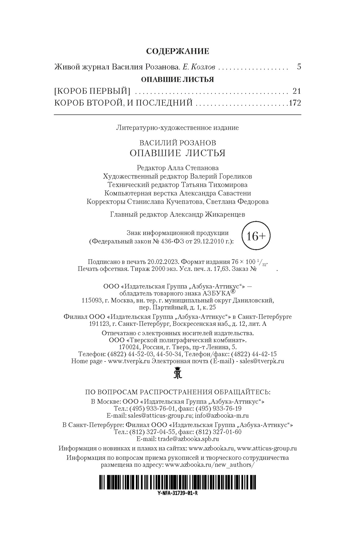 Василий Розанов - один из самых оригинальных русских философов и литературных критиков Серебряного века. Литературный труд был для него образом жизни, способом существования, ежедневным занятием и необходимостью. При этом Розанов никогда не пытался написать ничего собственно «художественного» и создал уникальный жанр - «опавшие листья», сопоставимый разве что с современным «живым журналом». Это отдельные записи мыслей и впечатлений, которые «текут непрерывно». Их последовательность и образует сюжет этой книги.| Издательство | Азбука |