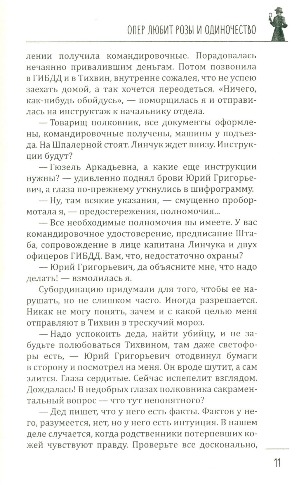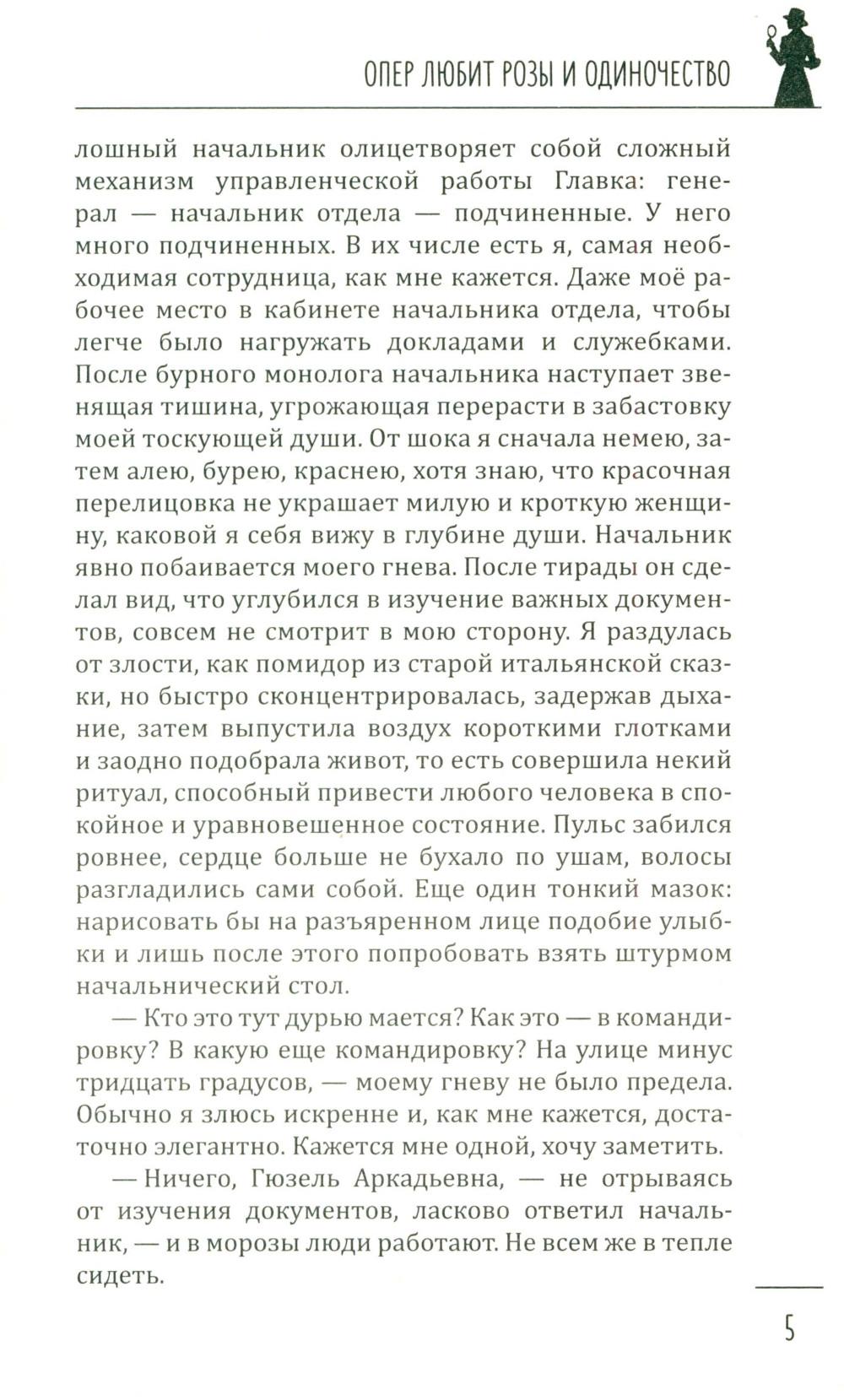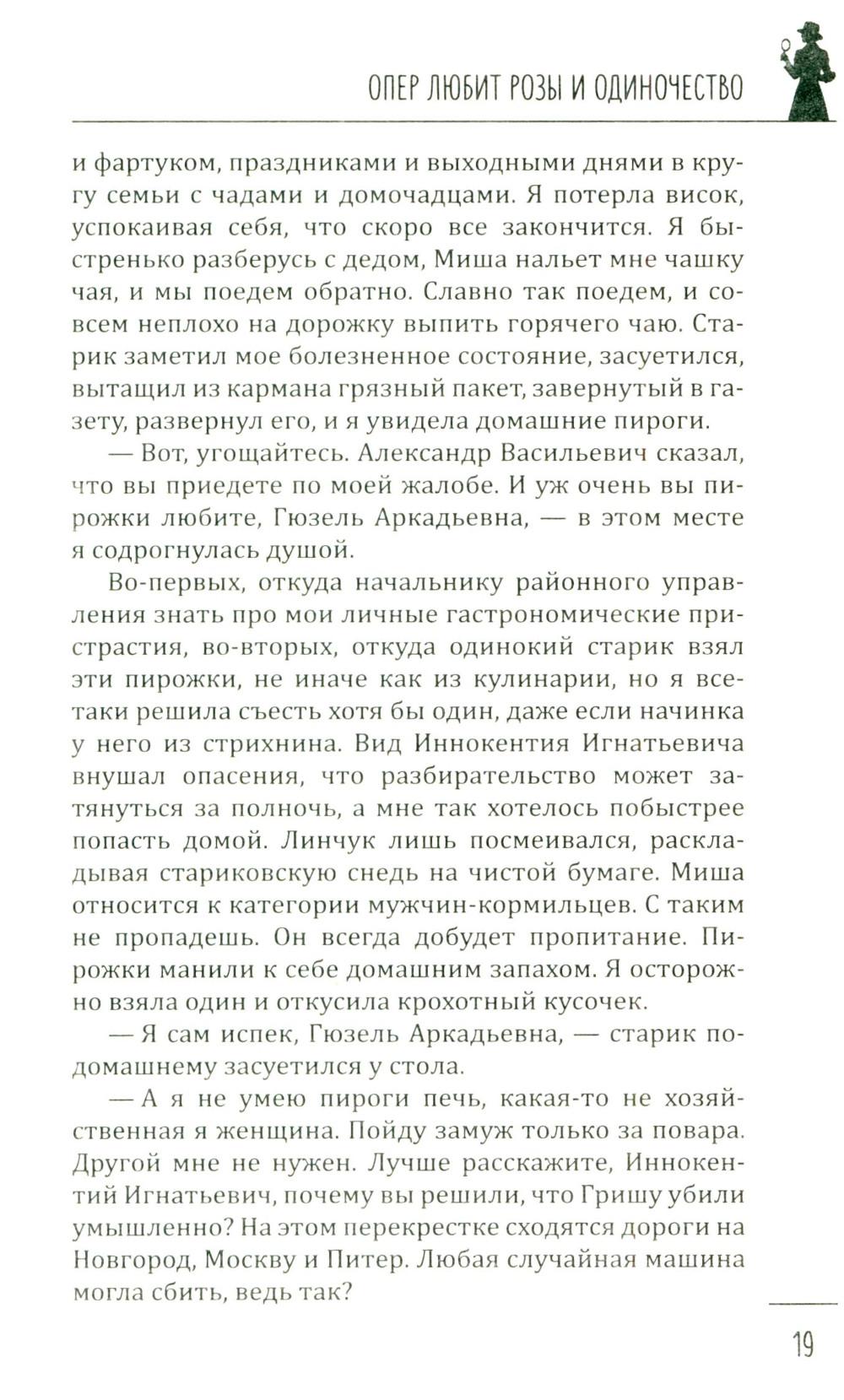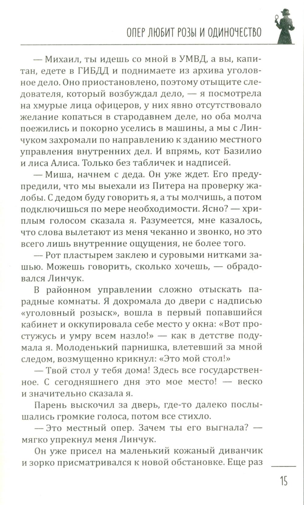 В книгу известной петербуржской писательницы Галии Мавлютовой вошли два ее увлекательных детектива, главными героями которых являются женщины. В первом из них - «Опер любит розы и одиночество» - за подполковником Гюзелью Юмашевой закрепилась слава, что все самые сложные дела, которые раскрыть невозможно, в управлении спихивают ей. Это потому, что, по ее словам, она принадлежит к «братству ненормальных» и спокойно в тридцатиградусный мороз повисает голыми руками на железных перекладинах соседского балкона очень важного свидетеля и таким путем попадает в квартиру... Во втором - «Капкан для капитана» - у пугливой домохозяйки Валентины не было другой печали, кроме заботы о любимом муже. Все, что так нравилось ему, - уютное семейное гнездышко, вкусные обеды и ужины - прекрасно удавалось верной жене. Но пришла беда - отворяй ворота. Муж похищен - и чтобы его снова увидеть, ей нужно найти крупную сумму денег. Что делать? Искать, и она выходит на тропу войны...| Издательство | Вече |