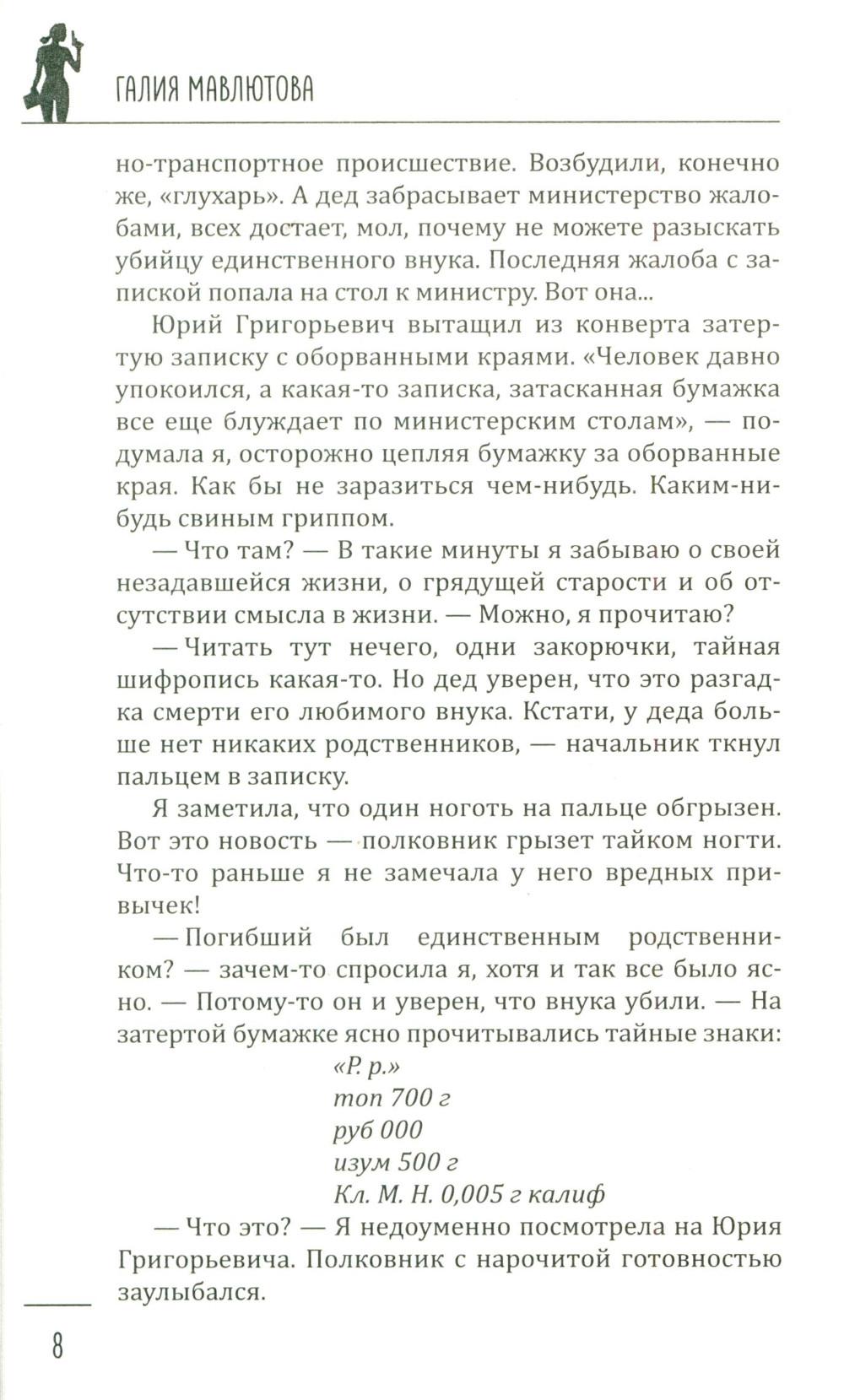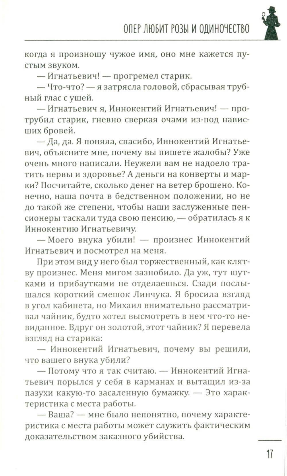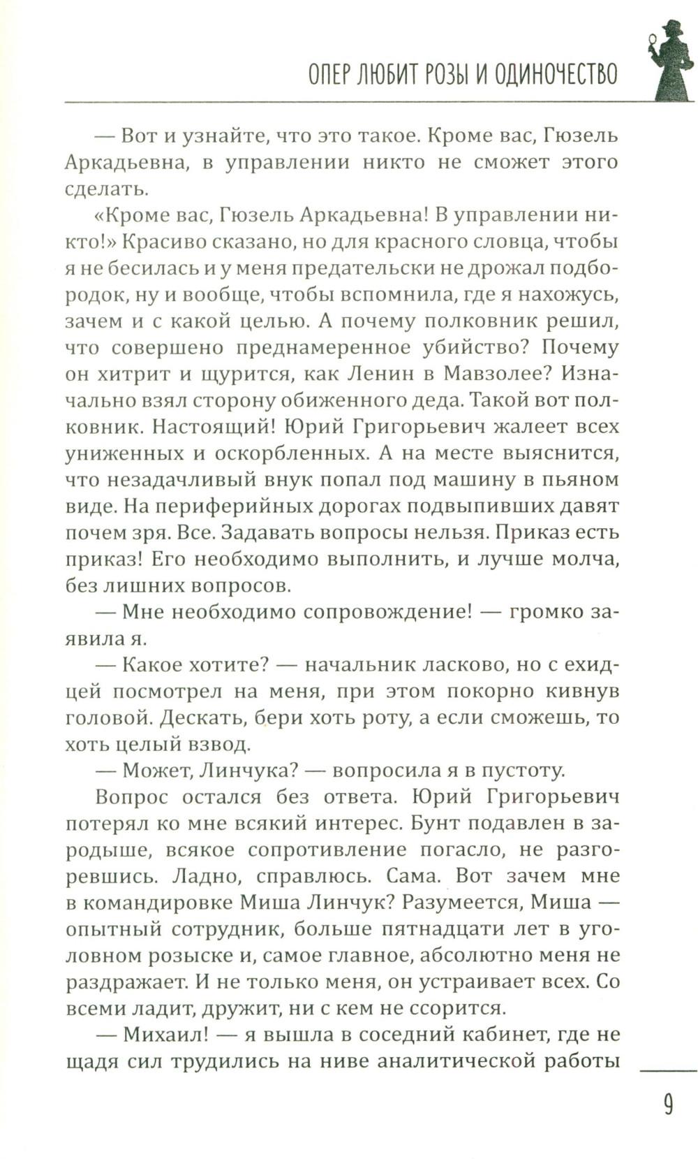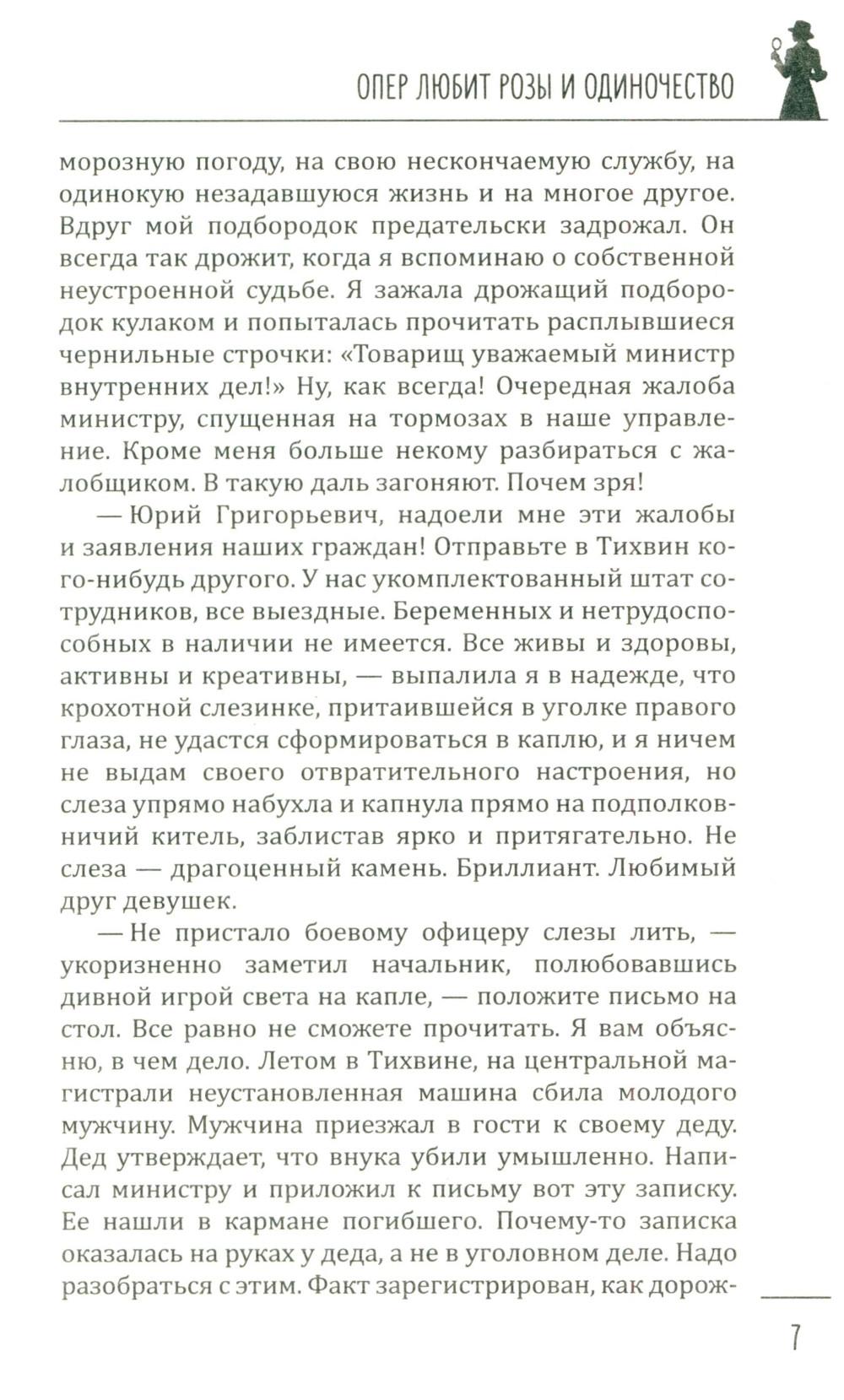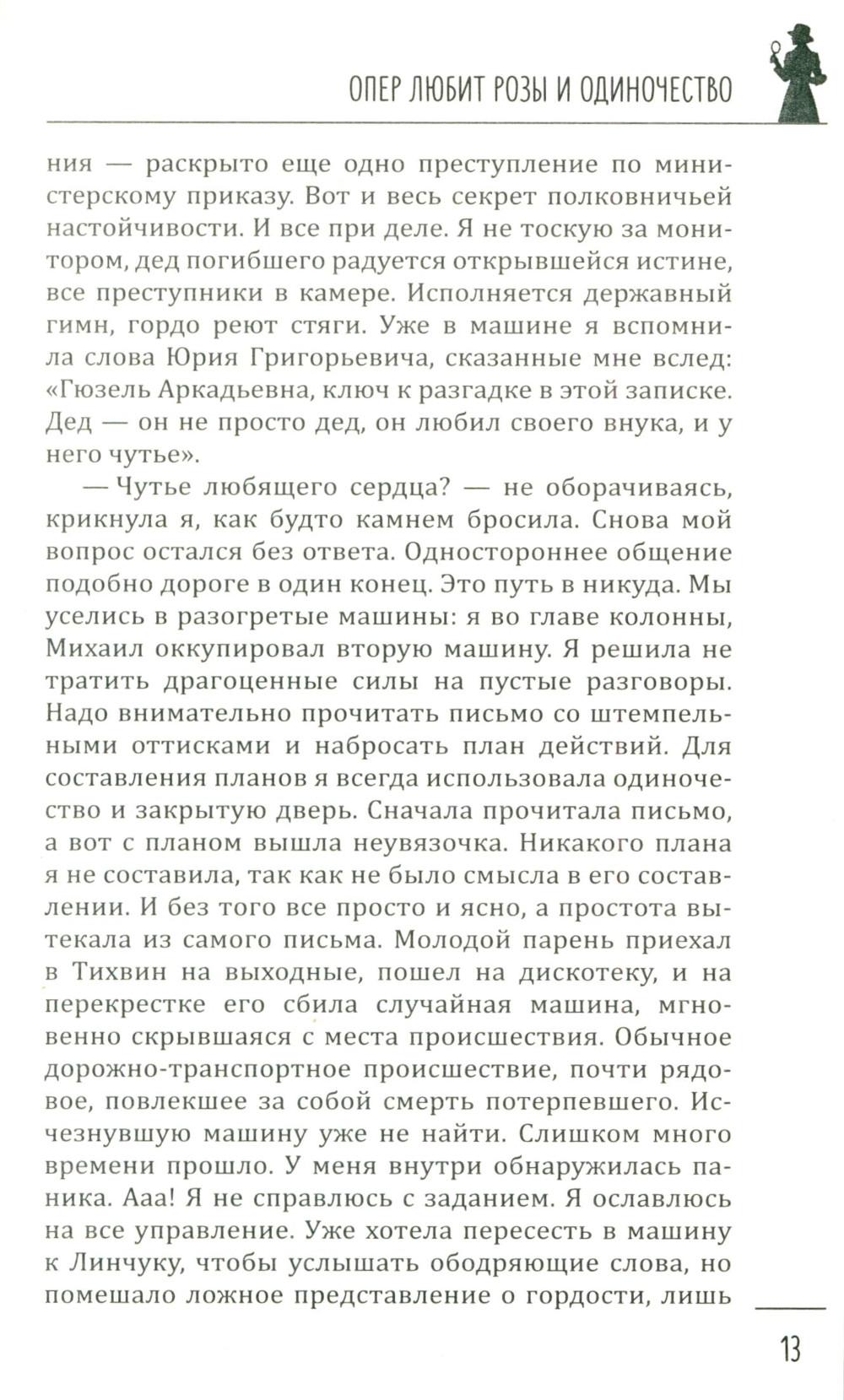 В книгу известной петербуржской писательницы Галии Мавлютовой вошли два ее увлекательных детектива, главными героями которых являются женщины. В первом из них - «Опер любит розы и одиночество» - за подполковником Гюзелью Юмашевой закрепилась слава, что все самые сложные дела, которые раскрыть невозможно, в управлении спихивают ей. Это потому, что, по ее словам, она принадлежит к «братству ненормальных» и спокойно в тридцатиградусный мороз повисает голыми руками на железных перекладинах соседского балкона очень важного свидетеля и таким путем попадает в квартиру... Во втором - «Капкан для капитана» - у пугливой домохозяйки Валентины не было другой печали, кроме заботы о любимом муже. Все, что так нравилось ему, - уютное семейное гнездышко, вкусные обеды и ужины - прекрасно удавалось верной жене. Но пришла беда - отворяй ворота. Муж похищен - и чтобы его снова увидеть, ей нужно найти крупную сумму денег. Что делать? Искать, и она выходит на тропу войны...| Издательство | Вече |