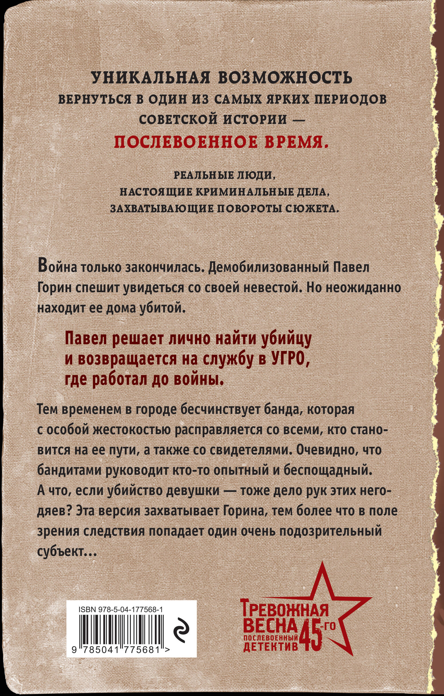 Война только закончилась. Демобилизованный Павел Горин спешит увидеться со своей невестой. Но неожиданно находит ее дома убитой. Павел решает лично найти убийцу и возвращается на службу в угро, где работал до войны. Тем временем в городе бесчинствует банда, которая с особой жестокостью расправляется со всеми, кто становится на ее пути, а также со свидетелями. Очевидно, что бандитами руководит кто-то опытный и беспощадный. А что, если убийство девушки - тоже дело рук этих негодяев? Эта версия захватывает Горина, тем более что в поле зрения следствия попадает один очень подозрительный субъект… Уникальная возможность вернуться в один из самых ярких периодов советской истории - в послевоенное время. Реальные люди, настоящие криминальные дела, захватывающие повороты сюжета. Персонажи, похожие на культовые образы фильма «Место встречи изменить нельзя». Дух времени, трепетно хранящийся во многих семьях. Необычно и реалистично показанная «кухня» повседневной работы советской милиции.| Издательство | ООО "Издательство "Эксмо" |