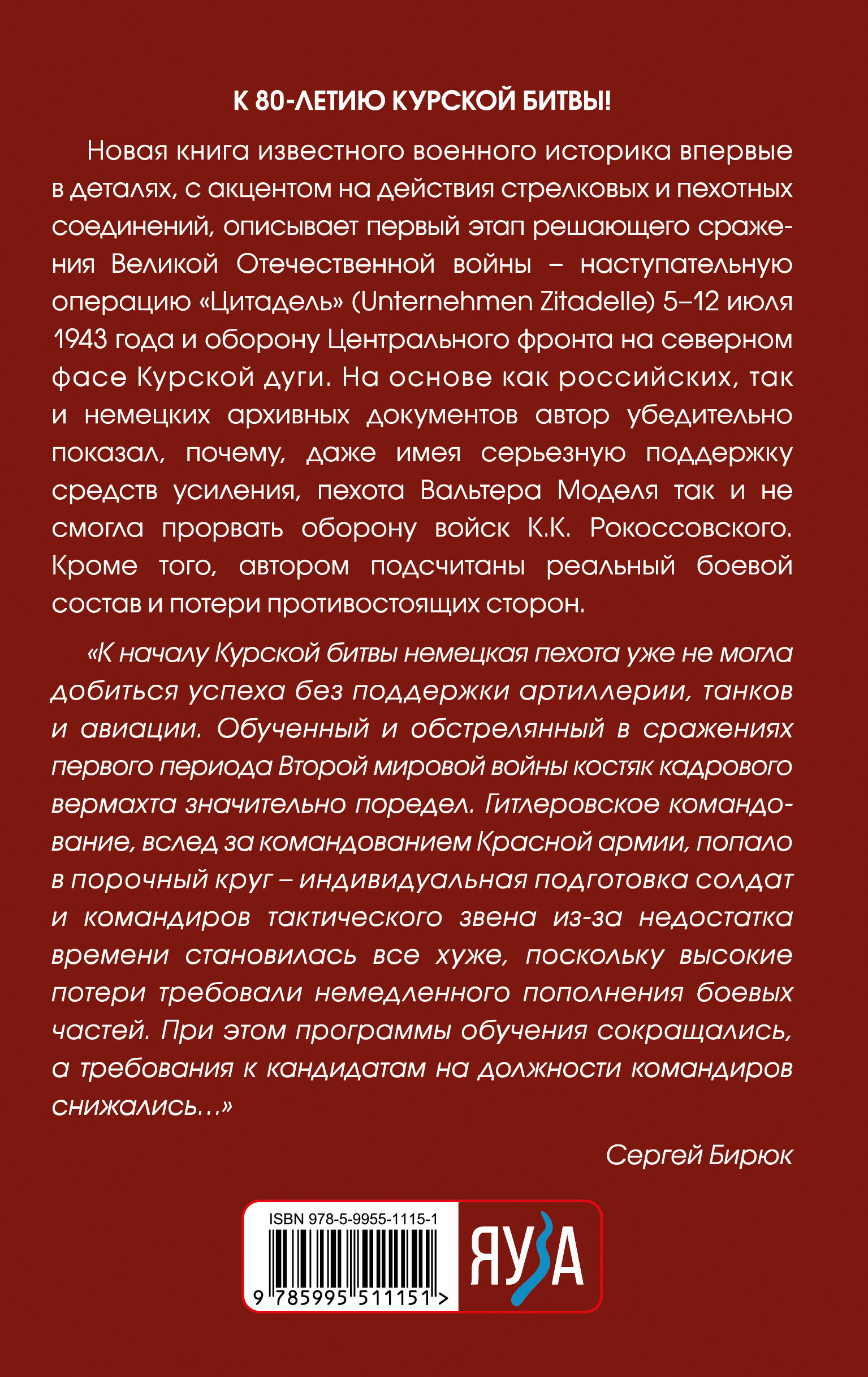 К 80-ЛЕТИЮ КУРСКОЙ БИТВЫ! Новая книга известного военного историка впервые в деталях, с акцентом на действия стрелковых и пехотных соединений, описывает первый этап решающего сражения Великой Отечественной войны - наступательную операцию «Цитадель» (Unternehmen Zitadelle) 5-12 июля 1943 года и оборону Центрального фронта на Северном фасе Курской дуги. На основе как российских, так и немецких архивных документов автор убедительно показал, почему, даже имея серьезную поддержку средств усиления, пехота Вальтера Моделя так и не смогла прорвать оборону войск К.К. Рокоссовского. Кроме того, автором подсчитаны реальный боевой состав и потери противостоящих сторон. «К началу Курской битвы немецкая пехота уже не могла добиться успеха без поддержки артиллерии, танков и авиации. Обученный и обстрелянный в сражениях первого периода Второй мировой войны костяк кадрового Вермахта значительно поредел. Гитлеровское командование, вслед за командованием Красной Армии, попало в порочный круг - индивидуальная подготовка солдат и командиров тактического звена из-за недостатка времени становилась все хуже, поскольку высокие потери требовали немедленного пополнения боевых частей. При этом программы обучения сокращались, а требования к кандидатам на должности командиров снижались…» - Сергей Бирюк| Издательство | Яуза-пресс ООО |