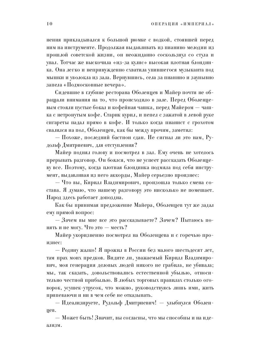 «Операция "Империал"» - первый политический роман, который был написан автором в период распада Советского Союза. Начинается он с неожиданной, казалось бы, и роковой встречи в Нью-Йорке (для советского времени - в очень непростом месте) следователя по особо важным делам при Генеральном прокуроре СССР Кирилла Оболенцева с эмигрантом Рудольфом Майером. Встреча эта изменила не только их жизни, но и жизни многих сильных мира сего. И когда наш герой начал свое тихое следствие, оно громом небесным прокатилось по многим коридорам власти...| Издательство | Рипол Классик |