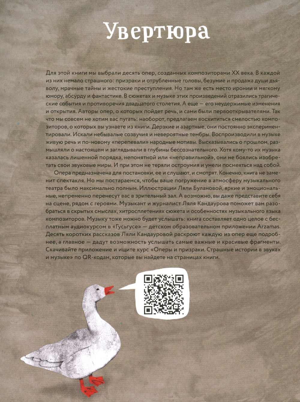 В этой книге собраны 10 известных опер русских и зарубежных композиторов. Они были написаны в XX столетии, в век трагических событий и потрясений мирового масштаба, которые нашли отражение и в искусстве. Вы найдете здесь оперы на классические сюжеты и оригинальные темы, которые могли появиться только в XX веке. Подчас они полны мрака, призраков прошлого и настоящего, тайн и безумия. Мы надеемся, что они помогут вам по-новому взглянуть на оперный жанр, показав его многообразие и глубину. А может быть, вам захочется сходить в театр или включить трансляцию какой-нибудь премьеры. Спектакли нужно и слушать, и смотреть. Картинки в книге позволят вам представить себя в театре, познакомят с действующими лицами опер и помогут разобраться в сюжетах. Музыку тоже можно будет услышать: книга составляет одно целое с бесплатным аудиокурсом от «Гусьгуся» - детского приложения Arzamas. Десять коротких рассказов Ляли Кандауровой раскроют каждую из опер еще подробнее, а главное - дадут возможность услышать самые важные и красивые фрагменты. Ляля Кандаурова - музыкант, журналист, автор популярных лекций, книг и подкастов о классической музыке для взрослых и детей, лауреат премии «Просветитель», ведущая YouTube-канала «Con Spirito». Ляля Буланова - художница, иллюстратор, дизайнер, соосновательница независимого издательства «Лес рук».| Издательство | Альпина Паблишер |