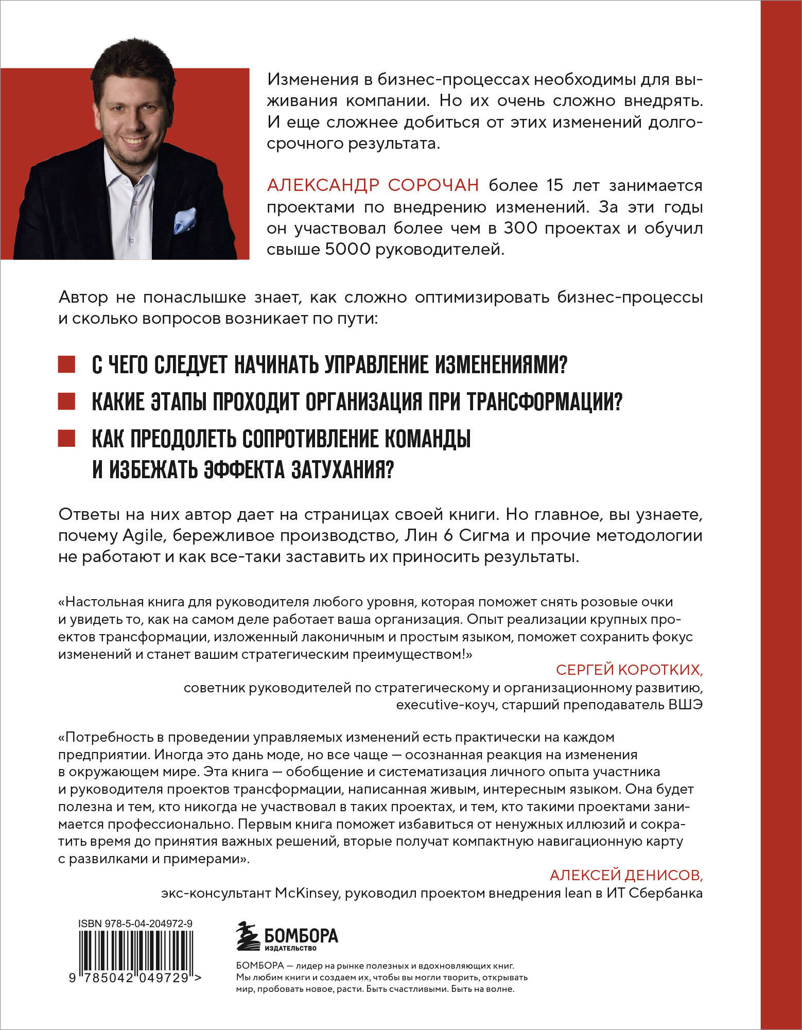 Изменения в бизнес-процессах необходимы для выживания компании. Но их очень сложно внедрять. И еще сложнее добиться от этих изменений долгосрочного результата. Александр Сорочан более 15 лет занимается проектами по внедрению изменений. За эти годы он участвовал более чем в 300 проектах и обучил свыше 5000 руководителей. Автор не понаслышке знает, как сложно оптимизировать бизнес-процессы и сколько вопросов возникает по пути. - С чего следует начинать управление изменениями? - Какие этапы проходит организации при трансформации? - Как преодолеть сопротивление команды и избежать эффекта затухания? Ответы на них автор дает на страницах своей книги. Но главное, вы узнаете почему Agile, бережливое производство, Лин 6 Сигма и прочие методологии не работают и как все-таки заставить их приносить результаты. «Настольная книга для руководителя любого уровня, которая поможет снять розовые очки и увидеть то, как на самом деле работает ваша организация. Опыт реализации крупных проектов трансформации, изложенный лаконичным и простым языком, поможет сохранить фокус изменений и станет вашим стратегическим преимуществом!» - Сергей Коротких, советник руководителей по стратегическому и организационному развитию, executive-коуч, старший преподаватель ВШЭ «Потребность в проведении управляемых изменений есть практически на каждом предприятии. Иногда это дань моде, но все чаще - осознанная реакция на изменения в окружающем мире. Эта книга - обобщение и систематизация личного опыта участника и руководителя проектов трансформации, написанная живым, интересным языком. Она будет полезна и тем, кто никогда не участвовал в таких проектах, и тем, кто такими проектами занимается профессионально. Первым книга поможет избавиться от ненужных иллюзий и сократить время до принятия важных решений, вторые получат компактную навигационную карту с развилками и примерами». - Алексей Денисов, экс-консультант McKinsey, руководил проектом внедрения lean в ИТ Сбербанка| Издательство | ООО "Издательство "Эксмо" |