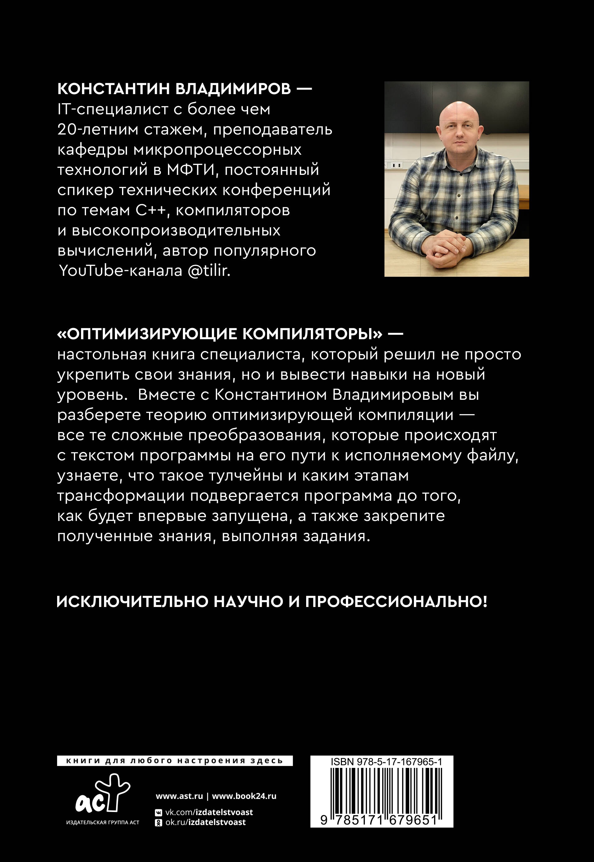 Константин Владимиров - IT-специалист с более чем 20-летним стажем, преподаватель кафедры микропроцессорных технологий в МФТИ, постоянный спикер технических конференций по темам С++, компиляторов и высокопроизводительных вычислений, автор популярного канала @tilir. "Оптимизирующие компиляторы" - настольная книга специалиста, который решил не просто укрепить свои знания, но и вывести навыки на новый уровень. Вместе с Константином Владимировым вы разберете теорию оптимизирующей компиляции - все те сложные преобразования, которые происходят с текстом программы на его пути к исполняемому файлу, узнаете, что такое тулчейны и каким этапам трансформации подвергается программа до того, как будет впервые запущена, а также закрепите полученные знания, выполняя задания. Исключительно научно и профессионально!| Издательство | Издательство "АСТ" |