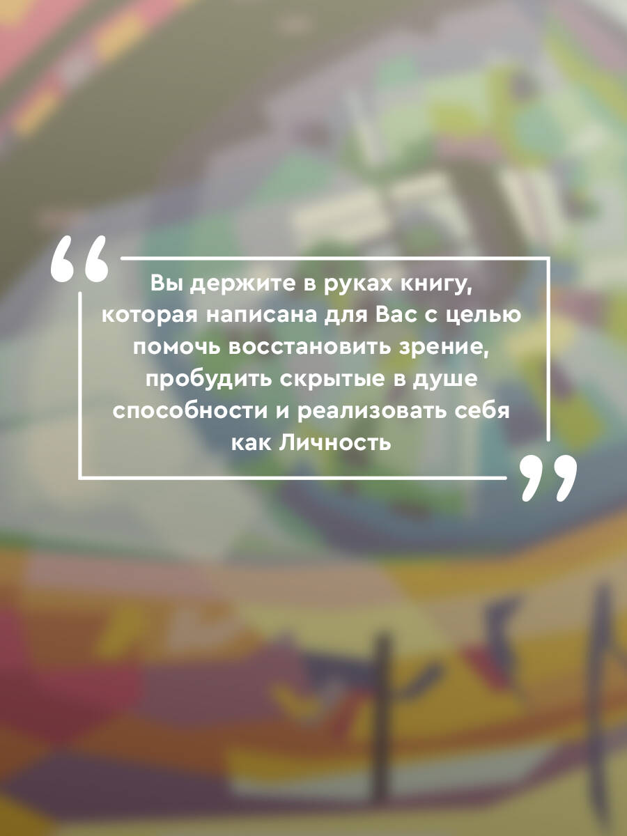 Вы держите в руках необычную книгу. Это не просто пособие по ускоренному обучению восстановления зрения, не просто трактат по философии для хронического больного-неудачника, а, скорее, руководство к действию. Здесь раскрывается система, признанная Международной ассоциацией независимых экспертов как самая эффективная среди известных альтернативных оздоровительных систем. Трудно определить жанр этой книги. Возможно, потому что такого просто еще нет. Совершенно точно, что эта книга никого не оставит равнодушным. Ни одного человека! У кого-то она вызовет неприязнь и агрессию, а кто-то за необычной формой откроет для себя что-то истинное и сокровенное. Одним словом, вы держите в руках книгу-тест на определение способности читать между строк, видеть глазами сердца и открывать глубинную суть вещей. Искренне желаем Вам хороших результатов тестирования!