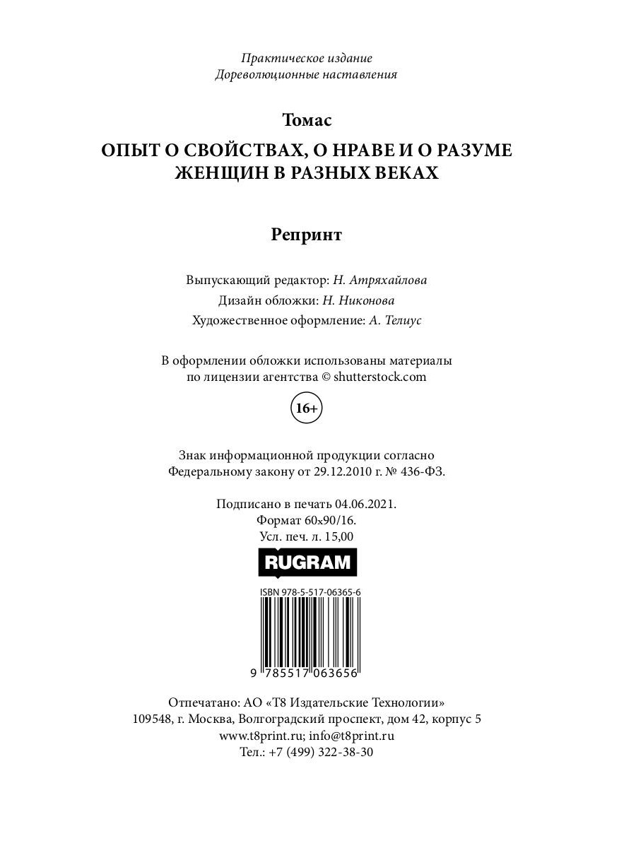 Сия книга представляет взору читателя только историческую картину, как происшествие деяний и опытов, которые могут служить основанием к достаточному сочинению. В нем увидят, может быть, что женщины способны ко всем достоинствам, каковые хотели бы в них видеть.| Издательство | Т8 RUGRAM |