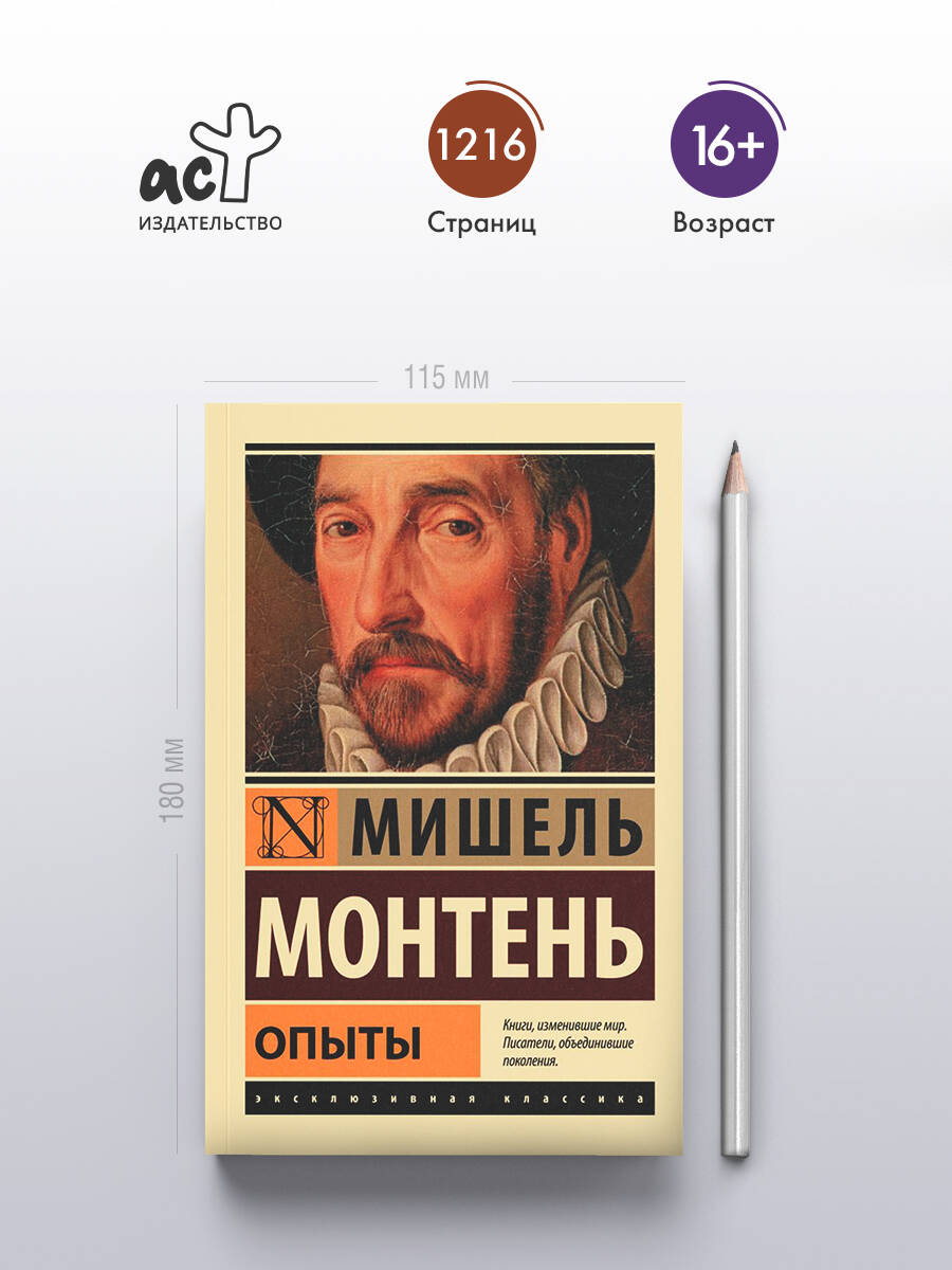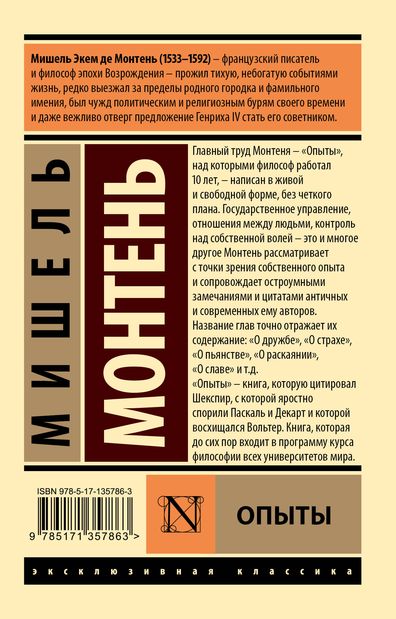 Мишель Монтень "Опыты" Мишель Экем де Монтень (1533-1592) - французский писатель и философ эпохи Возрождения, прожил тихую, небогатую событиями жизнь, редко выезжал за пределы родного городка и фамильного имения, был чужд политических и религиозных бурь своего времени - и даже вежливо отверг предложение Генриха IV стать его советником. Главный труд Монтеня - "Опыты", над которыми философ работал 10 лет, - написан в живой и свободной форме, без четкого плана. Государственное управление, отношения между людьми, власть над собственной волей - это и многое другое философ рассматривает с точки зрения собственного опыта и сопровождает остроумными замечаниями и цитатами античных и современных ему авторов. Название глав точно отражает их содержание: "О дружбе", "О страхе", "О пьянстве", "О раскаянии", "О славе" и т.д. "Опыты" - книга, которую цитировал Шекспир, с которой яростно спорили Паскаль и Декарт, и которой восхищался Вольтер. Книга, которая до сих пор входит в программу курса философии всех университетов мира.