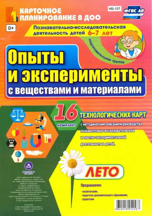 В комплекте 16 технологических карт с методическим описанием руководства познавательно-исследовательской и опытно-экспериментальной деятельностью детей.