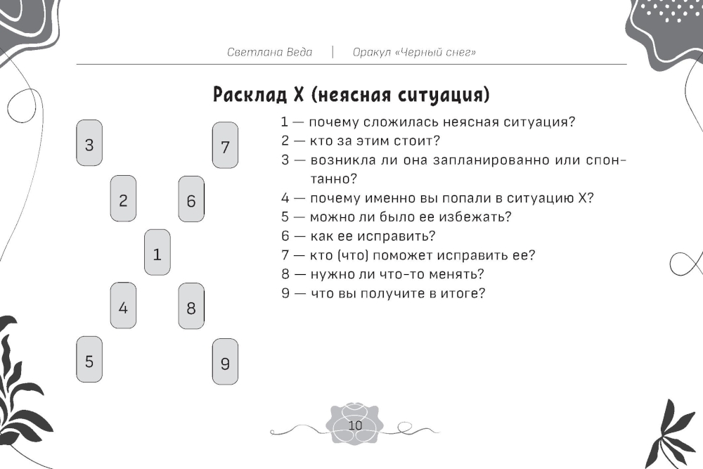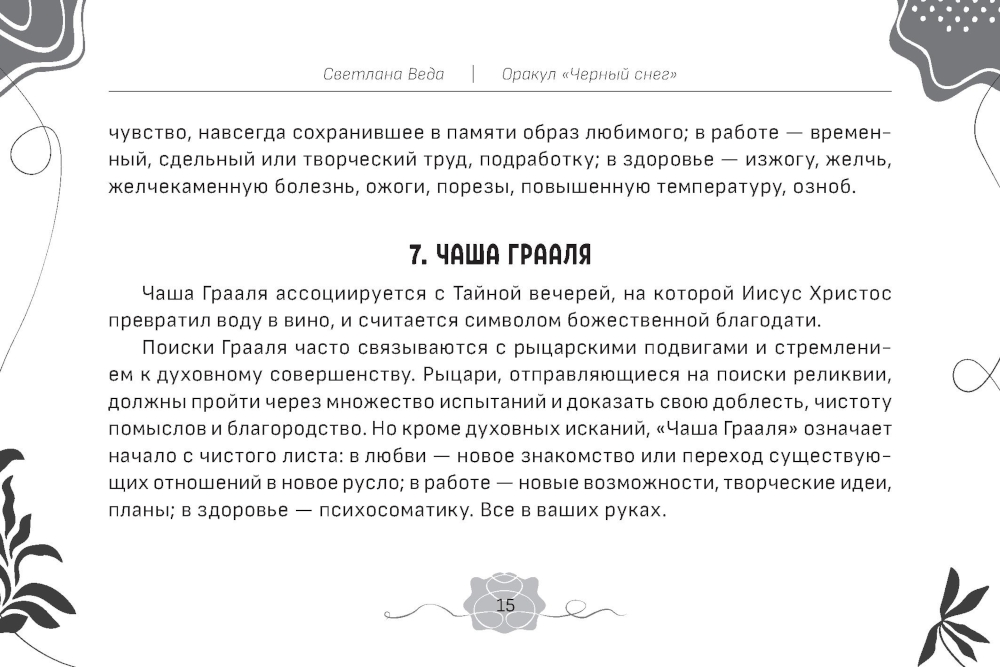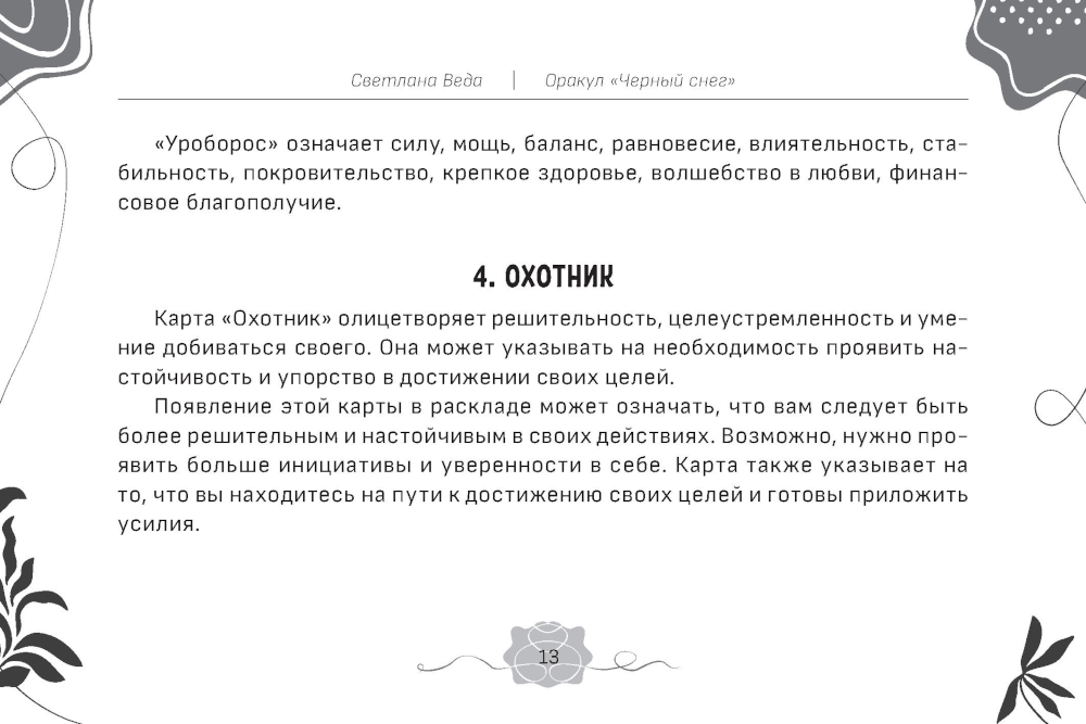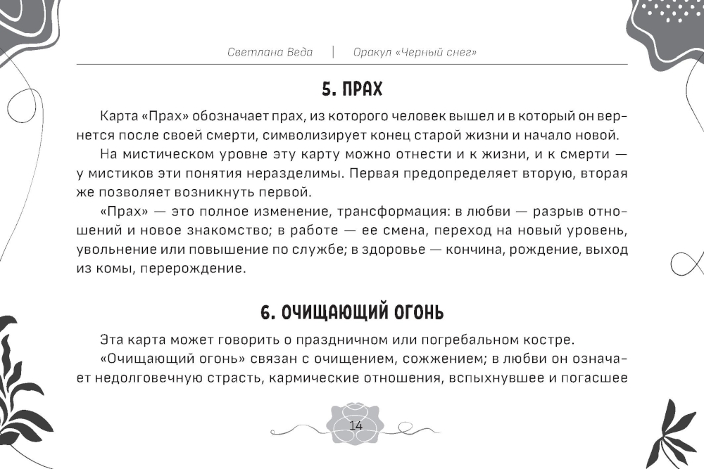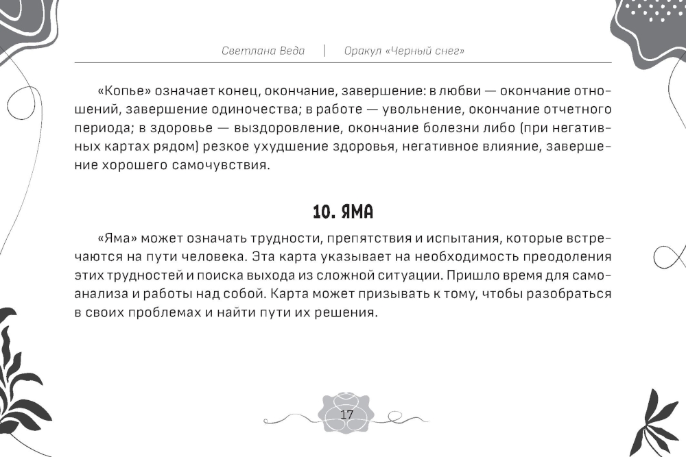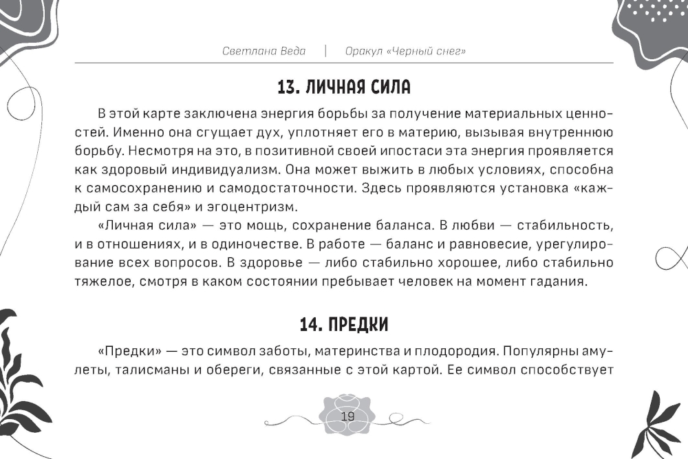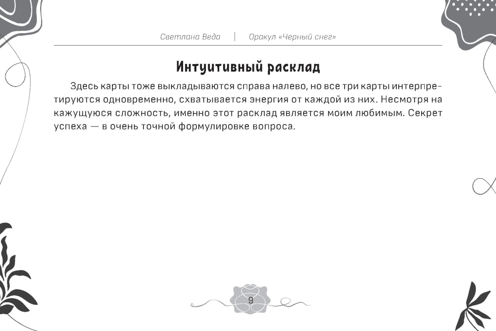 Название новой колоды Светланы Веды «Черный снег» символизирует единство противоположностей, тонкий баланс добра и зла. Оно говорит о том, что нет плохих людей - есть плохие поступки. Нет света без тьмы. Нет тени без света. Так и в оракуле сочетаются карты светлого и темного порядка, которые в равной степени дают подсказки и направляют, а также воздействуют на ситуацию. С их помощью вы сможете предсказывать и делать диагностику, очищать пространство, избавляться от врагов, привлекать деньги, любовь, удачу. Исполнять задуманные желания, видеть вещие сны, дарить близким счастье. «Черный снег» подходит для магического воздействия. В колоде есть карты с исцеляющим и защитным эффектом. Автор также подскажет, как обратить карты негативного порядка себе во благо.| Издательство | ИГ Весь |