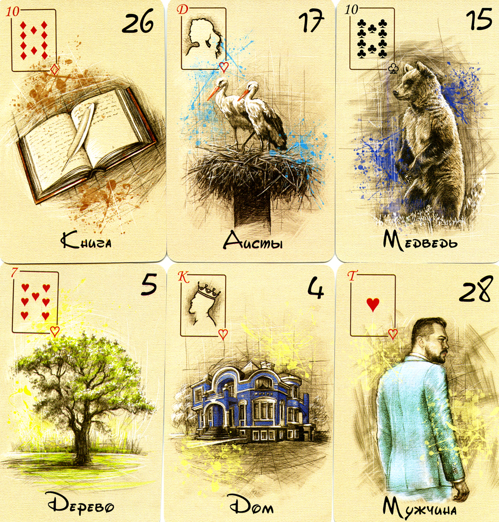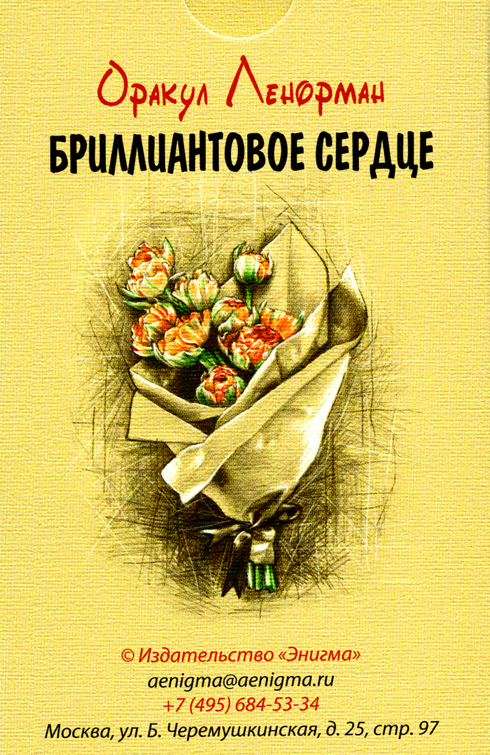В основе колоды Оракул Ленорман "Бриллиантовое сердце" лежат авторские изображения. На каждой карте указано ее название и приведена соответствующая карта игральной колоды. Помимо 36 листов изображений есть еще 2 листа с дополнительными сигнификаторами, а также 2 листа подсказок для раскладов Гранд-табло и пикетное табло. В комплекте с картами идет Руководство - брошюра 40 страниц, в которой приводятся значения карт.| Издательство | Энигма |