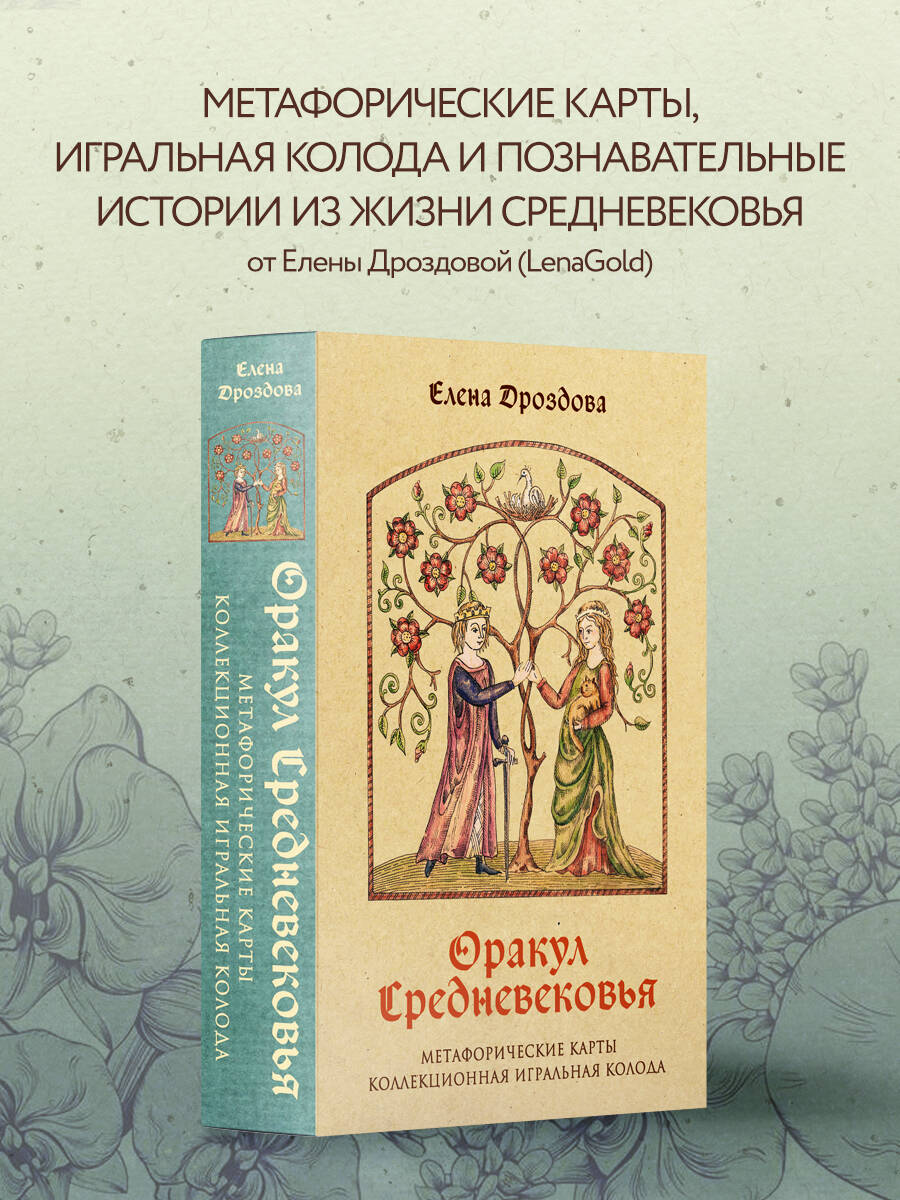 Оракул Средневековья - это уникальный авторский проект, в котором собраны базовые мифологические образы из событий эпохи средневековья и увлекательные истории о древних принцессах и драконах, о королях и шутах. Эти истории - не исследование культуры Средних веков. Это увлекательное чтение и полезный инструмент для гадания, исследования собственного подсознания и игры. Автор - писатель и художник Елена Дроздова (LENAGOLD) собрала уникальную коллекцию образов и легенд. Каждое описание карты - это познавательная история. Каждый образ включает в себя один из базовых символов архетипов. Это полная игральная колода (54 карты), которую можно использовать как оракул для гадания, а так же как метафорические карты.