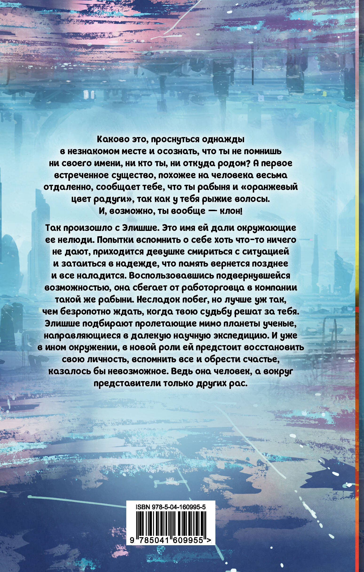 Каково это - проснуться однажды в незнакомом месте и осознать, что ты не помнишь ни своего имени, ни кто ты, ни откуда родом? А первое встреченное существо, похожее на человека весьма отдаленно, сообщает тебе, что ты рабыня и «оранжевый цвет радуги», так как у тебя рыжие волосы. И, возможно, ты вообще - клон! Так произошло с Элишше. Это имя ей дали окружающие ее нелюди. Попытки вспомнить о себе хоть что-то ничего не дают, приходится девушке смириться с ситуацией и затаиться в надежде, что память вернется позднее и все наладится. Воспользовавшись подвернувшейся возможностью, она сбегает от работорговца в компании такой же рабыни. Несладок побег, но лучше уж так, чем безропотно ждать, когда твою судьбу решат за тебя. Элишше подбирают пролетающие мимо планеты ученые, направляющиеся в далекую научную экспедицию. И уже в ином окружении, в новой роли ей предстоит восстановить свою личность, вспомнить все и обрести счастье, казалось бы невозможное. Ведь она человек, а вокруг представители только других рас.| Издательство | ООО "Издательство "Эксмо" |