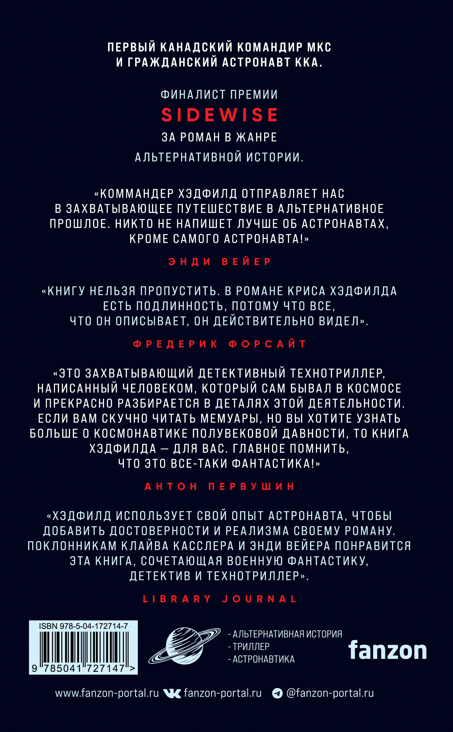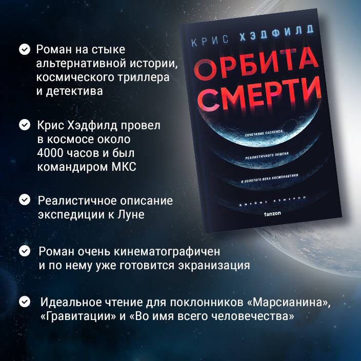 Автор и астронавт Крис Хэдфилд представляет этот триллер и «захватывающее путешествие» в темное сердце космической гонки времен «холодной войны». 1973 год. Последняя, сверхсекретная миссия на Луну. Три астронавта на крошечном космическом корабле, в четверти миллиона миль от дома. В четверти миллиона миль от помощи. НАСА собирается запустить «Аполлон 18». Миссия была объявлена научной, но диспетчер полета Каз Земекис знает, что есть и скрытая цель. Разведка обнаружила секретный спутник-шпион, и только у «Аполлона-18» есть единственный шанс его разрушить. Каз всеми силами борется за то, чтобы экипаж НАСА был на шаг впереди своих соперников, но несчастный случай открывает, что не все участники программы являются теми, за кого их принимали. Когда политические ставки достигнут критического уровня, Белому дому и Кремлю останется только наблюдать, как их астронавты столкнутся на поверхности Луны, далеко за пределами досягаемости закона или помощи спасателей. Полный захватывающих технических подробностей, которые так понравились поклонникам «Марсианина», и напоминающий о захватывающей клаустрофобии, сюжетных поворотах и саспенсе «Охоты за "Красным Октябрем"», «Орбита смерти» - это триллер с высокими ставками, не похожий ни на один другой. Крис Хэдфилд запечатлел яростные перегрузки при запуске, ледяное одиночество космоса и страх покинуть космический корабль, вращающийся вокруг Земли со скоростью 17 000 миль в час, так, как может только тот, кто испытал все это в реальной жизни. Пристегнитесь и начинайте обратный отсчет! «Коммандер Хэдфилд отправляет нас в захватывающее путешествие в альтернативное прошлое. Никто не напишет лучше об астронавтах, кроме самого астронавта!» - Энди Вейер «Книгу нельзя пропустить. В романе Криса Хэдфилда есть подлинность, потому что все, что он описывает, он действительно видел». - Фредерик Форсайт «"Орбита смерти" - захватывающий детективный технотриллер, написанный человеком, который сам бывал в космосе и прекрасно разбирается в деталях этой деятельности. Если вам скучно читать мемуары, но вы хотите узнать больше о космонавтике полувековой давности, то книга Хэдфилда - для вас. Главное, помнить, что это всё-таки фантастика!» - Антон Первушин «В романе есть что-то для каждого. Дерзкий космический полет, политическая интрига, шпионский триллер и старый добрый юмор - все это в одной захватывающей истории!» - Space Explored «Хэдфилд использует свой опыт астронавта, чтобы добавить достоверности и реализма своему роману. Поклонникам Клайва Касслера и Энди Вейера понравится эта книга, сочетающая военную фантастику, детектив и технотриллер». - Library Journal| Издательство | ООО "Издательство "Эксмо" |