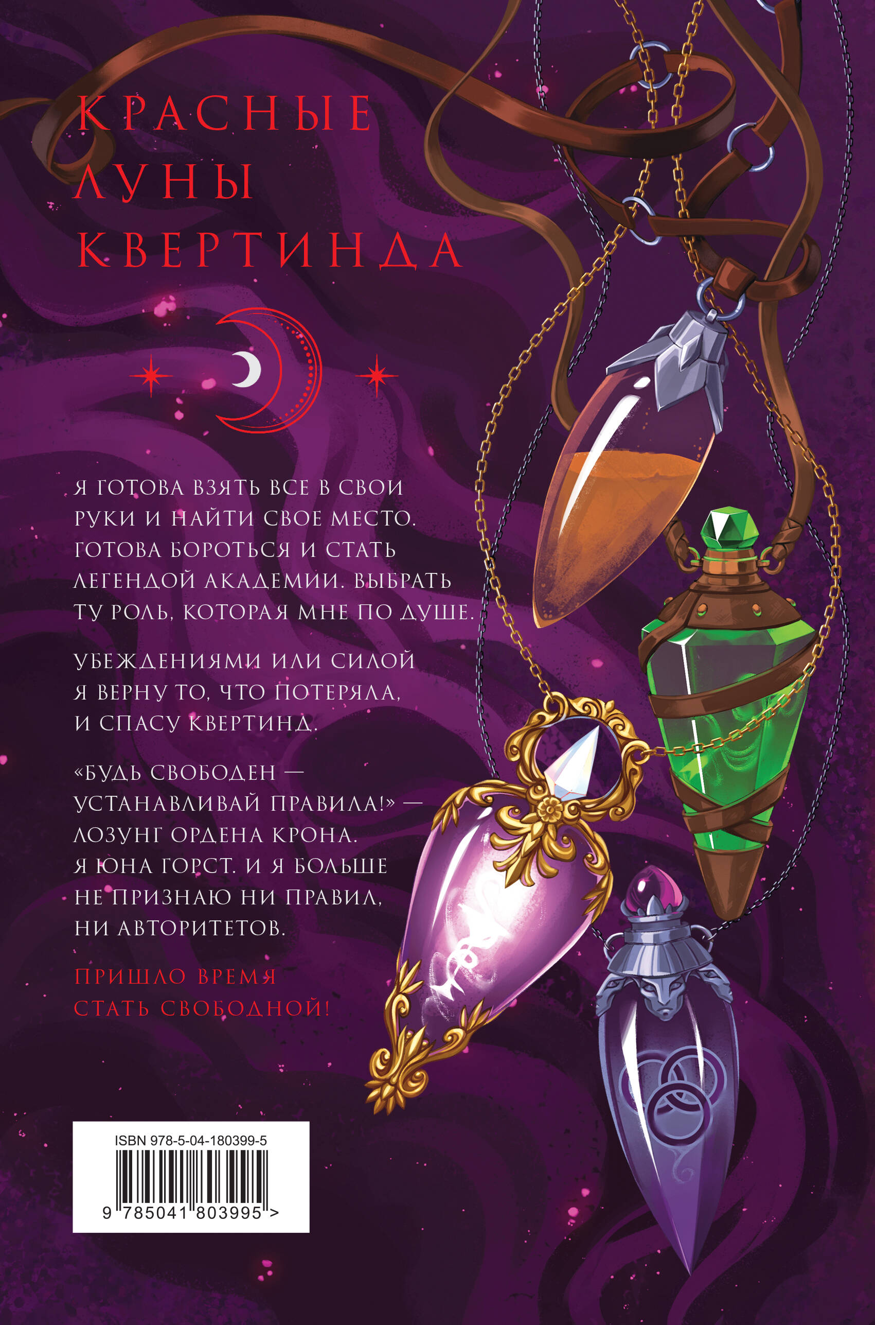 Я готова взять все в свои руки и найти свое место. Готова бороться и стать легендой академии. И выбрать ту роль, которая мне по душе. Убеждениями или силой я верну то, что потеряла, и спасу Квертинд. «Будь свободен - устанавливай правила!» - лозунг Ордена Крона. Я Юна Горст. И я больше не признаю ни правил, ни авторитетов. Пришло время стать свободной! Продолжение фэнтези-саги «Красные луны Квертинда», рассказывающей про Юну Горст - девушку, которая не знает страха, зато точно знает, чего хочет. Ей движут смелость и целеустремленность, и какие бы преграды ни ставили перед ней жизнь или враги, Юна их преодолеет. Но что происходит с теми, кто добивается поставленных целей? Похоже, у судьбы на Юну свои планы, ведь не просто так она попадает в паутину заговоров и интриг. Есть ли у Юны настоящие друзья или все это - лишь дым и искаженные отражения в зеркалах? Кому можно доверять и всегда ли нужно разрушать старое, чтобы построить новое? И какую роль в жизни Юны сыграет загадочный незнакомец в маске?| Издательство | ООО "Издательство "Эксмо" |