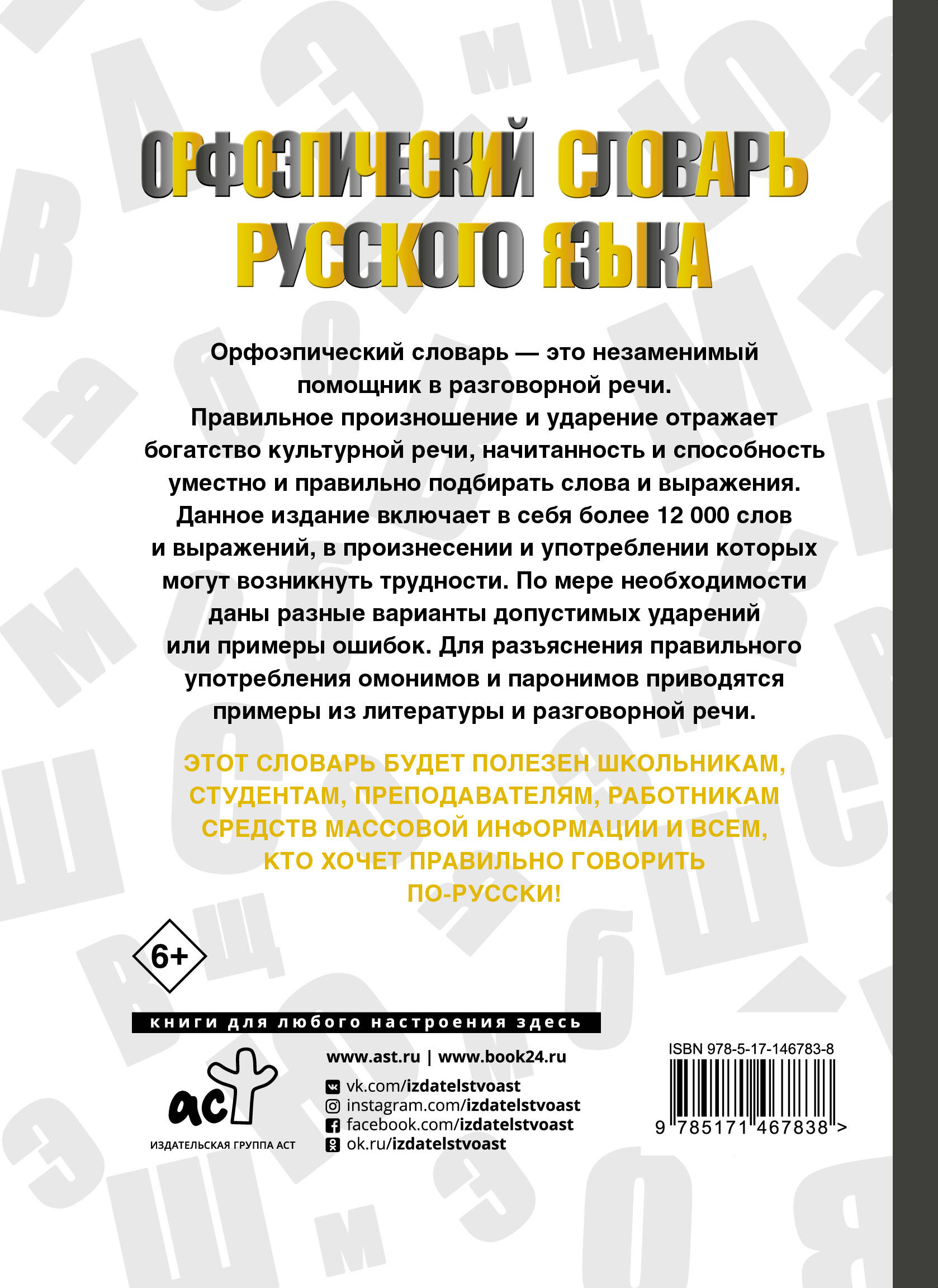 Орфоэпический словарь русского языка поможет правильно расставлять ударение в словах, вызывающих сомнение, повысить грамотность и уровень речевой культуры. Издание содержит более 12 000 слов и выражений, в том числе устаревающих и устаревших, с расстановкой ударения согласно актуальным нормам языка. Слова сопровождаются вариантами допустимых ударений, в том числе запретительными примерами, а также литературные и исторические справки об изменении нормы. У изменяемых слов даются формы, вызывающие трудности в постановке ударения. Омонимы и паронимы сопровождаются толкованиями и примерами для разъяснения правильного употребления. Данное издание будет полезно всем, кто хочет говорить и писать правильно, а также тем, чья учебная и профессиональная деятельность требует высокого уровня грамотности.| Издательство | ИЗДАТЕЛЬСТВО "АСТ" |