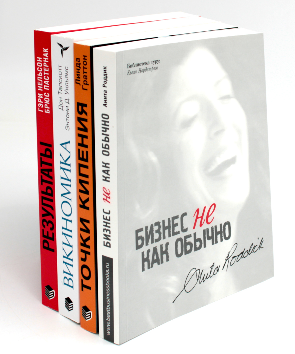 Комплект содержит книги: «Бизнес не как обычно» Путешествие предпринимателя за прибылью с принципамиАнита Роддик Забудьте о церкви и политике, если речь идет о власти и влиянии. Бизнес вот самый влиятельный общественный институт. Я убеждена, что сейчас как никогда раньше важна роль бизнеса как нравственного лидера. Главным для бизнеса должны быть не деньги, а ответственность. Общественное благо, а не личная нажива. Анита Роддик одна из наиболее неоднозначных, противоречивых и преуспевающих женщин в мировом бизнесе. В книге Бизнес не как обычно рассказана история самой Роддик и ее компании The Body Shop со всеми ее взлетами и падениями на протяжении последнего десятилетия. По ходу рассказа автор переворачивает с ног на голову представление общества о бизнесе и доказывает, что международная компания вполне способна соблюдать нормы социальной ответственности, не жертвуя при этом ни здравым смыслом, ни прибылью.История компании The Body Shop это история успеха двадцатого века. Эта книга о том, как это произошло и почему.Издательство BestBusinessBooks новое имя на рынке деловой литературы. Наша миссия лучшие книги о бизнесе и для бизнеса. Говоря лучшие, мы имеем в виду лучшие идеи, лучшие мысли, лучшие подходы все, что позволяет сохранить в бизнесе страсть, ум и энергию. Ведь как говорит Кьелл Нордстрем в глобальной деревне нам нужны лучшие. «Точки кипения» Вне зависимости от условий рынка, организации не могут позволить себе прекратить вкладывать средства в развитие инноваций. И если вы инвестируете в инновации в период кризиса, будьте уверены: за вами последуют немногие. Таким образом, ваши шансы стать «первопроходцем» многократно возрастают. Однако процесс развития инноваций не сводится только к вложению средств в исследования и разработки. Инновации - это определённый склад мышления. В своей книге Линда Граттон объясняет, как настроиться «на волну» инноваций и создать климат, который будет стимулировать разработку инновационных решений. Надеемся, что эта книга послужит полезным инструментом для дальнейшего развития вашего бизнеса! «Викиномика. Как массовое сотрудничество изменяет все» На гавайском слово «вики» означает «быстрый», и авторы ярко описывают изменчивый мир интернет-сообщества, массовое или глобальное сотрудничество, и то, что эти изменения означают для бизнеса и технологий. Наиболее известный пример это Википедия, он-лайновая энциклопедия, которую пишут, компилируют, редактируют и заново редактируют "обычные люди". В книге рассматриваются и менее известные истории успеха глобального сотрудничества такие как Procter & Gamble, BMW, Lego и группа нишевых ИТ и софтверных компаний. Авторы утверждают, что, возможно, мы имеем дело с рождением новой эры, золотого века, аналогичного итальянскому Возрождению и Афинской демократии, и дают лидерам бизнеса представление о широких возможностях массового сотрудничества. «Результаты» Лев Толстой писал: «Все счастливые семьи похожи друг на друга, каждая несчастливая семья несчастлива по-своему». Что-то похожее верно и в отношении компаний. Безусловно, у каждой компании есть индивидуальность, и эта индивидуальность может либо помогать, либо препятствовать её результативности. Мы изучали этот вопрос в течение десяти лет, исследуя то, что называем «Организационная ДНК». За это время в нашем иссле