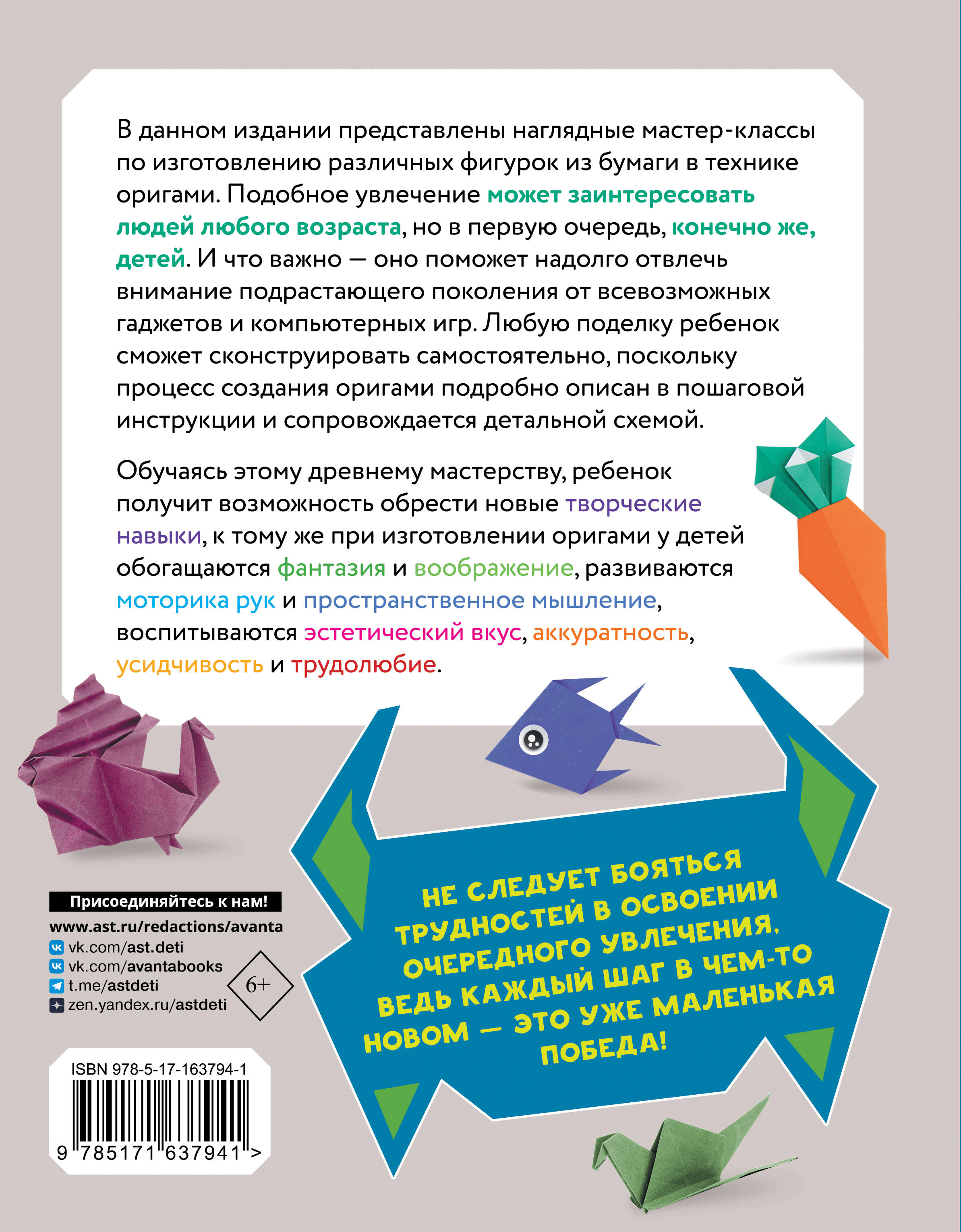 Данное издание ориентировано в первую очередь на детей 8-10 лет, благодаря большому разнообразию представленных моделей оригами на самые разные темы оно заинтересует как мальчиков, так и девочек. И главное - процесс создания каждой бумажной фигурки здесь подробно описан в пошаговой инструкции и сопровождается детальной схемой. Представленные мастер-классы будут понятны всем юным мастерам оригами без исключения. Оригами - прекрасный способ привить ребенку с раннего возраста любовь к искусству, развить у него тонкий эстетический вкус, научить познавать окружающий мир через призму творчества. Эта книга научит его самостоятельно складывать из бумаги различные фигурки, создавать картины с элементами аппликации в технике оригами, своими руками изготавливать предметы, имеющие художественную ценность и практическое применение. Кроме того, дети смогут расширить свой кругозор, ведь в издании приведены интересные факты об окружающем мире, соответствующие теме каждого мастер-класса. Для младшего школьного возраста.