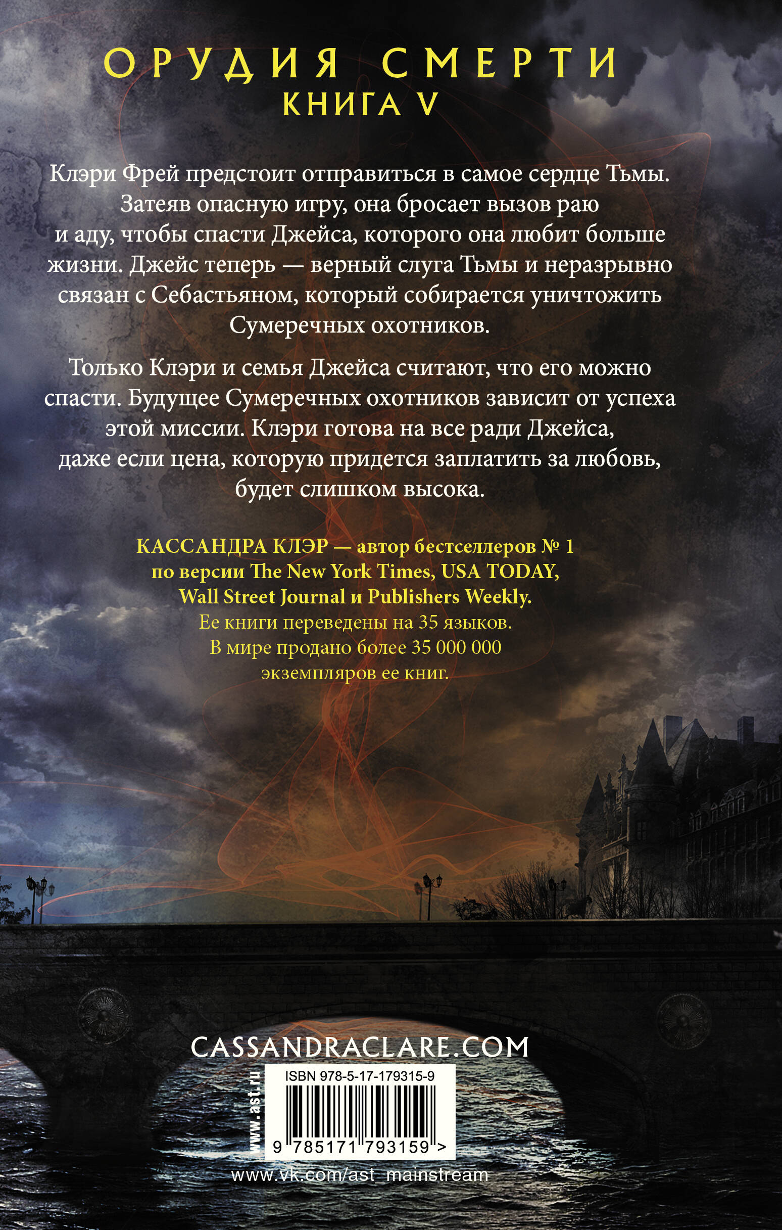 Клэри Фрей предстоит отправиться в самое сердце Тьмы. Затеяв опасную игру, она бросает вызов раю и аду, чтобы спасти Джейса, которого она любит больше жизни. Джейс теперь - верный слуга Тьмы и неразрывно связан с Себастьяном, который собирается уничтожить Сумеречных охотников. Только Клэри и семья Джейса считают, что его можно спасти. Будущее Сумеречных охотников зависит от успеха этой миссии. Клэри готова на все ради Джейса, даже если цена, которую придется заплатить за любовь, будет слишком высока.| Издательство | Издательство "АСТ" |