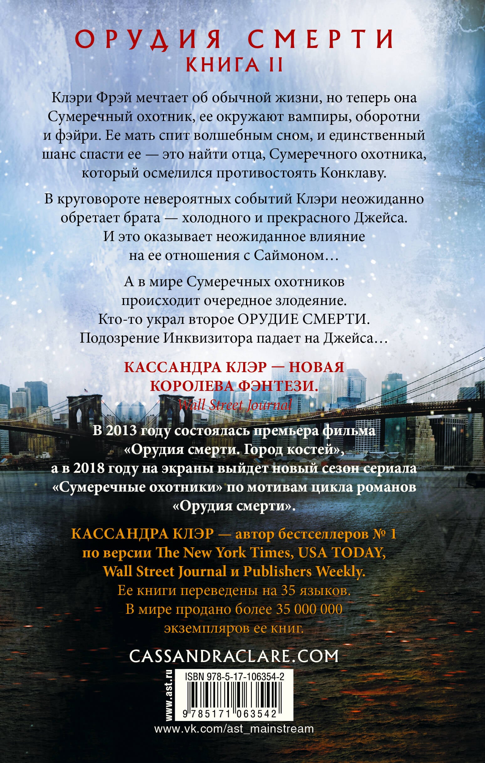 «Орудия смерти». Книга II «Кассандра Клэр - новая королева фэнтези». - Wall Street Journal В 2013 году состоялась премьера фильма «Орудия смерти: город костей», а в 2018 году на экраны выйдет новый сезон сериала «Сумеречные охотники» по мотивам цикла романов «Орудия смерти». Кассандра Клэр - автор бестселлеров № 1 по версии The New York Times, USA TODAY, Wall Street Journal и Publishers Weekly. Ее книги переведены на 35 языков. В мире продано более 35 000 000 экземпляров ее книг. cassandraclare.com| Издательство | ИЗДАТЕЛЬСТВО "АСТ" |
