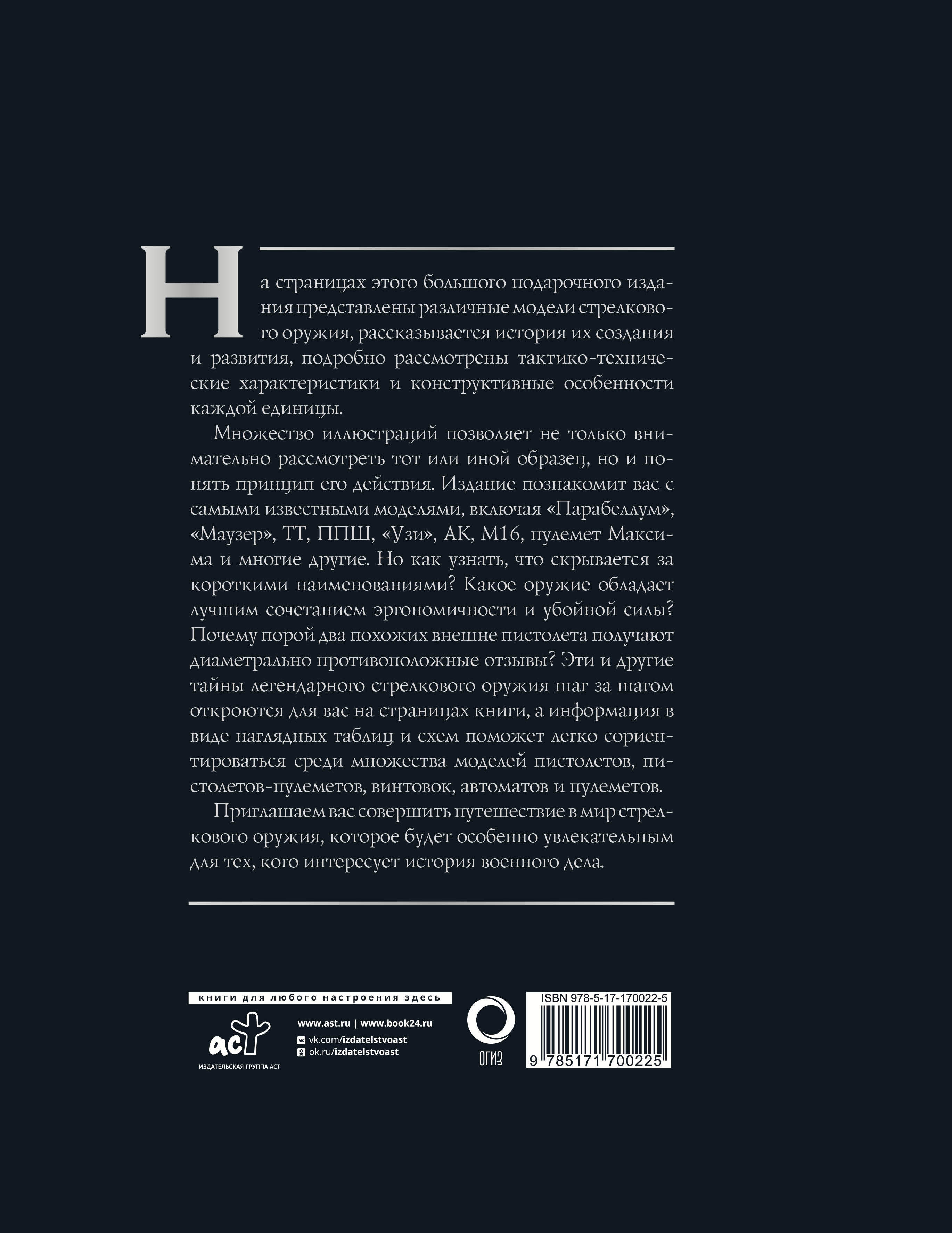 На страницах этого большого подарочного издания представлены различные модели стрелкового оружия, рассказывается история их создания и развития, подробно рассмотрены тактико-технические характеристики и конструктивные особенности каждой единицы. Множество иллюстраций позволяет не только внимательно рассмотреть тот или иной образец, но и понять принцип его действия. Издание познакомит вас с самыми известными моделями, включая "Парабеллум", "Маузер", ТТ, ППШ, "Узи", АК, М16, пулемет Максима и многие другие. Но как узнать, что скрывается за короткими наименованиями? Какое оружие обладает лучшим сочетанием эргономичности и убойной силы? Почему порой два похожих внешне пистолета получают диаметрально противоположные отзывы? Эти и другие тайны легендарного стрелкового оружия шаг за шагом откроются для вас на страницах книги, а информация в виде наглядных таблиц и схем поможет легко сориентироваться среди множества моделей пистолетов, пистолетов-пулеметов, винтовок, автоматов и пулеметов. Приглашаем вас совершить путешествие в мир стрелкового оружия, которое будет особенно увлекательным для тех, кого интересует история военного дела.| Издательство | Издательство "АСТ" |