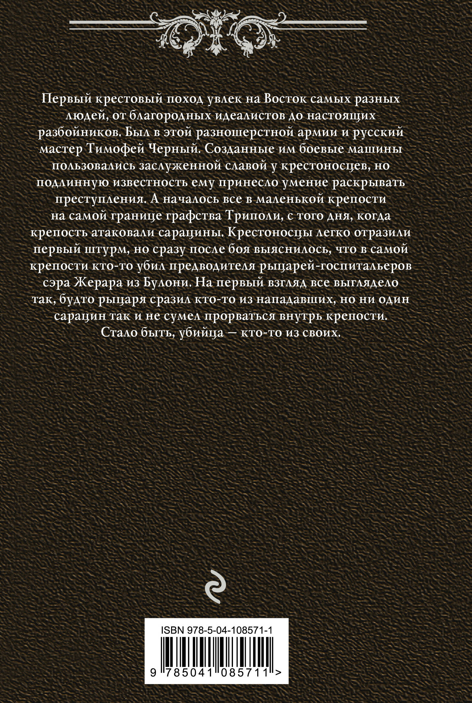 XII век, Ближний Восток. Пограничную крепость крестоносцев осаждают сарацины. Пока гарнизон отражал штурм, в крепости был убит предводитель рыцарей-госпитальеров сэр Жерар из Булони. Убит кем-то из тех, кто был внутри, то есть, кем-то из своих. Найти убийцу предстоит русскому мастеру Тимофею Черному.