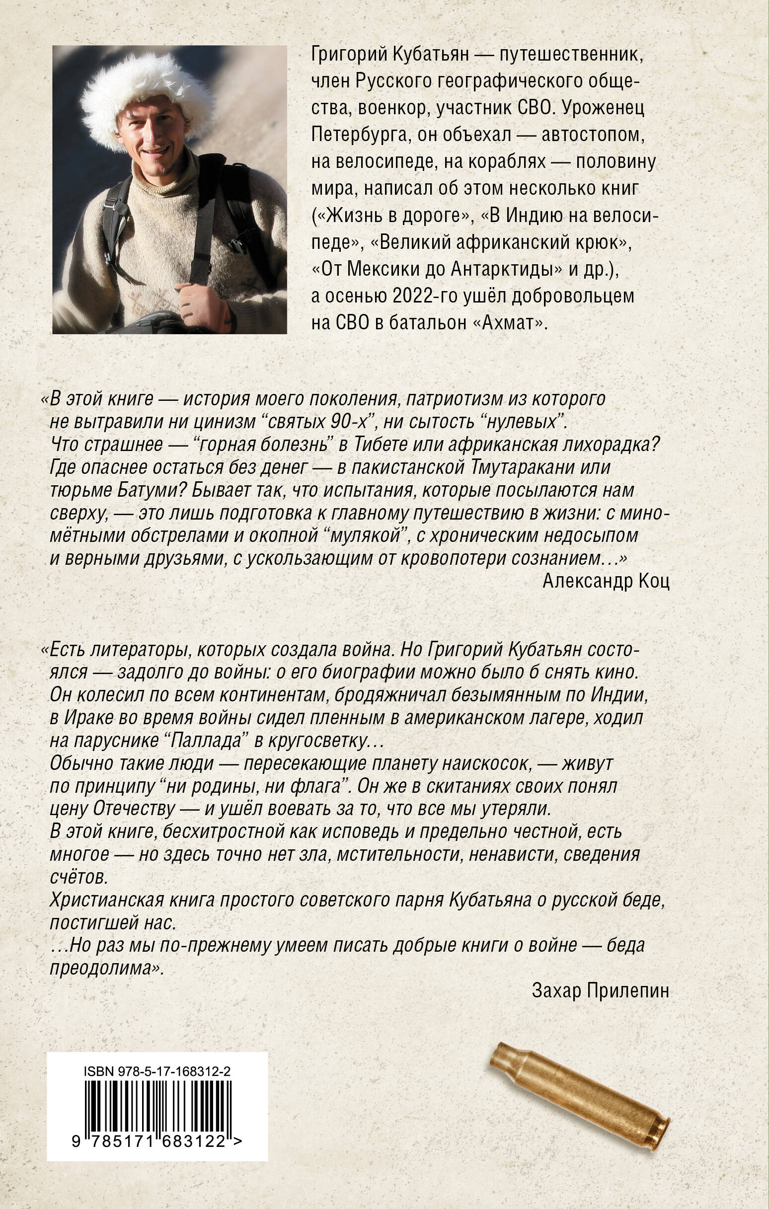 Григорий Кубатьян - путешественник, член Русского географического общества, военкор, участник СВО. Уроженец Петербурга, он объехал - автостопом, на велосипеде, на кораблях - половину мира, написал об этом несколько книг ("Жизнь в дороге", "В Индию на велосипеде", "Великий африканский крюк", "От Мексики до Антарктиды" и др.), а осенью 2022-го ушёл добровольцем на СВО в батальон "Ахмат". "В этой книге - история моего поколения, патриотизм из которого не вытравили ни цинизм "святых 90-х", ни сытость "нулевых". Что страшнее - "горная болезнь" в Тибете или африканская лихорадка? Где опаснее остаться без денег - в пакистанской Тмутаракани или тюрьме Батуми? Бывает так, что испытания, которые посылаются нам сверху, - это лишь подготовка к главному путешествию в жизни: с миномётными обстрелами и окопной "мулякой", с хроническим недосыпом и верными друзьями, с ускользающим от кровопотери сознанием…". Александр Коц "Есть литераторы, которых создала война. Но Григорий Кубатьян состоялся - задолго до войны: о его биографии можно было б снять кино. Он колесил по всем континентам, бродяжничал безымянным по Индии, в Ираке во время войны сидел пленным в американском лагере, ходил на паруснике "Паллада" в кругосветку… Обычно такие люди - пересекающие планету наискосок, - живут по принципу "ни родины, ни флага". Он же в скитаниях своих понял цену Отечеству - и ушёл воевать за то, что все мы утеряли. В этой книге, бесхитростной как исповедь и предельно честной, есть многое - но здесь точно нет зла, мстительности, ненависти, сведения счётов. Христианская книга простого советского парня Кубатьяна о русской беде, постигшей нас. …Но раз мы по-прежнему умеем писать добрые книги о войне - беда преодолима". Захар Прилепин| Издательство | Издательство "АСТ" |