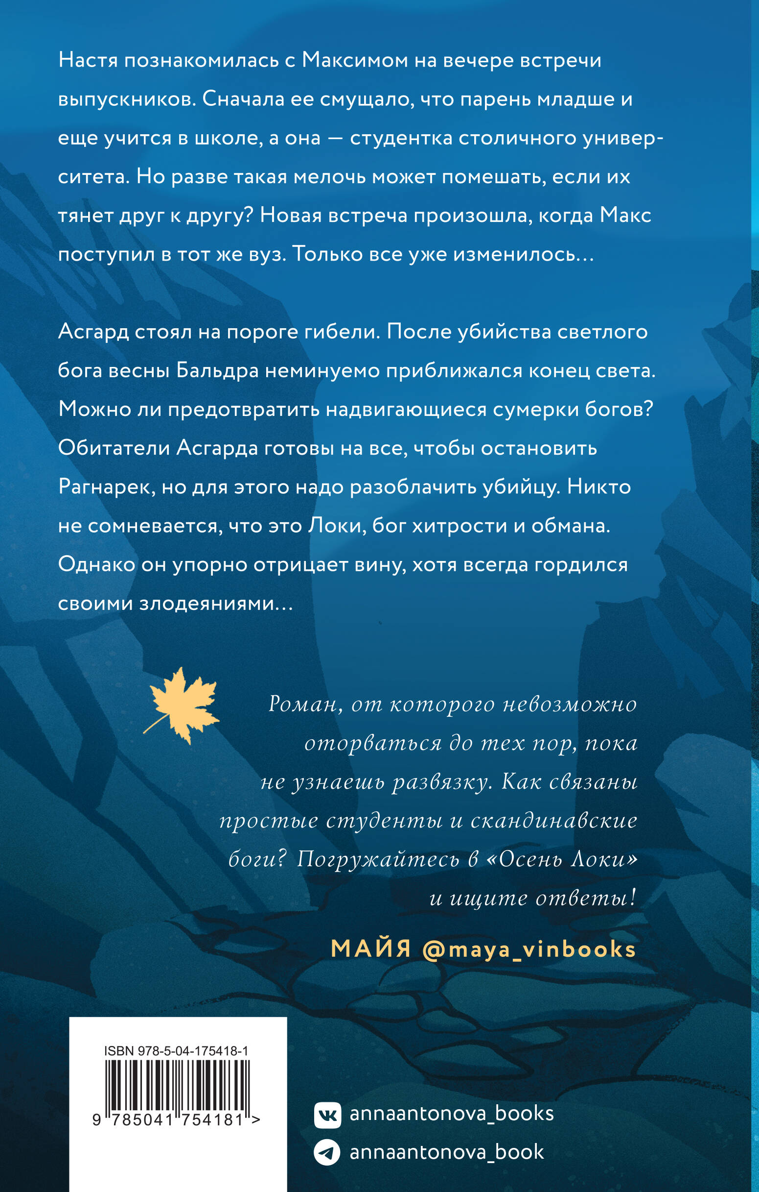 Имена скандинавских богов Тора, Одина и Локи знают все. Анна Антонова рассказывает их историю по-новому, находя свежие краски и неожиданные решения. Расследование убийства, случившегося в Асгарде, причудливым образом провоцирует захватывающие события в жизни обычных столичных студентов. Напряженный драматический сюжет, развивающийся в мире суровых северных богов, органично переплетается с судьбой наших современников, в жизни которых вдруг проявляется то, чему они не могут найти реалистичного объяснения. Настя познакомилась с Максимом на вечере встречи выпускников. Сначала ее смущало, что парень младше и еще учится в школе, а она - студентка столичного университета. Но разве такая мелочь может помешать, если их тянет друг к другу? Новая встреча произошла, когда Макс поступил в тот же вуз. Только все уже изменилось… Асгард стоял на пороге гибели. После убийства светлого бога весны Бальдра неминуемо приближался конец света. Можно ли предотвратить надвигающиеся сумерки богов? Обитатели Асгарда готовы на все, чтобы остановить Рагнарёк, но для этого надо разоблачить убийцу. Никто не сомневается, что это Локи, бог хитрости и обмана. Однако он упорно отрицает вину, хотя всегда гордился своими злодеяниями…| Издательство | ООО "Издательство "Эксмо" |