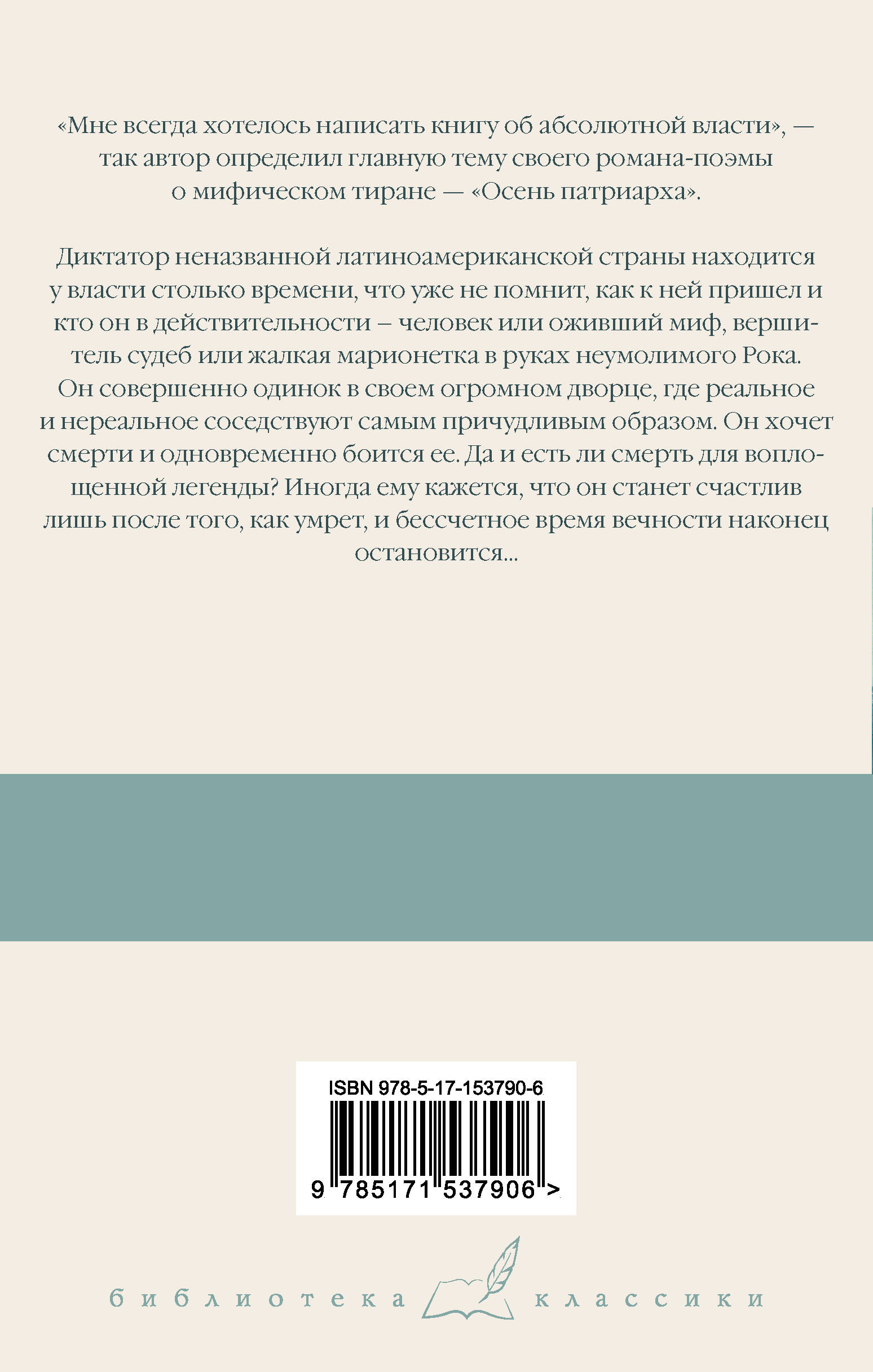Габриэль Гарсиа Маркес - величайший писатель ХХ века, лауреат Нобелевской премии, автор всемирно известных романов "Сто лет одиночества", "Любовь во время чумы" и "Осень патриарха". "Мне всегда хотелось написать книгу об абсолютной власти", - так автор определил главную тему своего произведения. Диктатор неназванной латиноамериканской страны находится у власти столько времени, что уже не помнит, как к ней пришел. Он - уже и человек, и оживший миф, и кукловод, и марионетка в руках Рока. Он совершенно одинок в своем огромном дворце, где реальное и нереальное соседствуют самым причудливым образом. Он хочет и боится смерти. Но… есть ли смерть для воплощения легенды? Возможно, счастлив властитель станет лишь когда умрет и поймет, что для него "бессчетное время вечности наконец закончилось"?