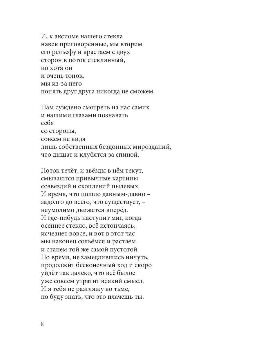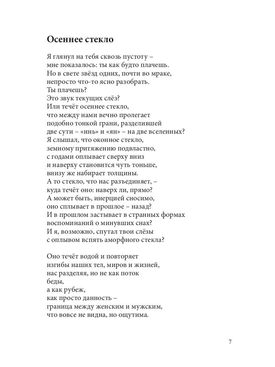 В сборник стихов вошли произведения последних лет, в основном любовная лирика. «Осеннее стекло» - это тонкая грань между женским и мужским мирами, которую нельзя стереть. «Осеннее» соответственно возрасту. Из-за этой грани двум противоположным полам невозможно понять друг друга. Это вечная тайна жизни.