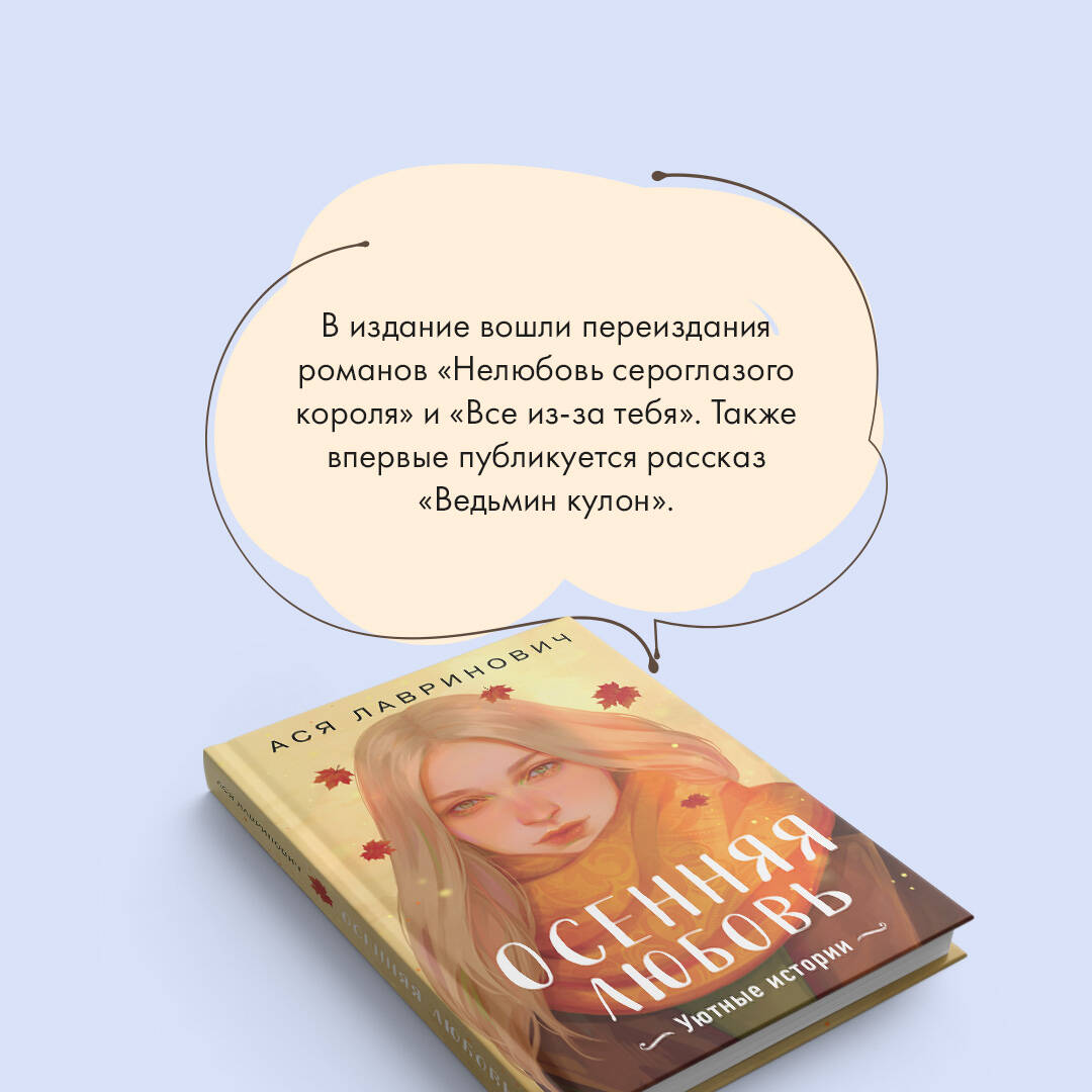 Три осенние истории от Аси Лавринович в новом подарочном оформлении! Невероятной красоты иллюстрация на обложке, закрашенный обрез, три цветные вклейки с персонажами из романов. В издание вошли переиздания романов: «Нелюбовь сероглазого короля» и «Все из-за тебя». А также впервые публикуется рассказ «Ведьмин кулон». Немного мистики - такого вы точно не ожидали от Аси Лавринович. Подарите себе и своим близким три увлекательные истории, которые идеально подойдут для уютных осенних вечеров. Самое время закутаться в теплый плед, налить себе какао с маршмеллоу и погрузиться в милые, добрые и невероятно атмосферные книги. Об авторе Ася Лавринович - один из самых популярных авторов российского янг эдалта в жанре современной сентиментальной прозы. Суммарный тираж ее проданных книг составляет более 1 млн экземпляров. Победитель премии «Выбор читателей 2023» на Livelib в номинации «Young adult. Лучшая книга о подростках и для подростков». На две книги Аси - «Загадай любовь» и «Нелюбовь сероглазого короля» - куплены права на экранизацию. А сериал по «Загадай любовь» уже можно посмотреть в онлайн-кинотеатре Okko.| Издательство | ООО "Издательство "Эксмо" |